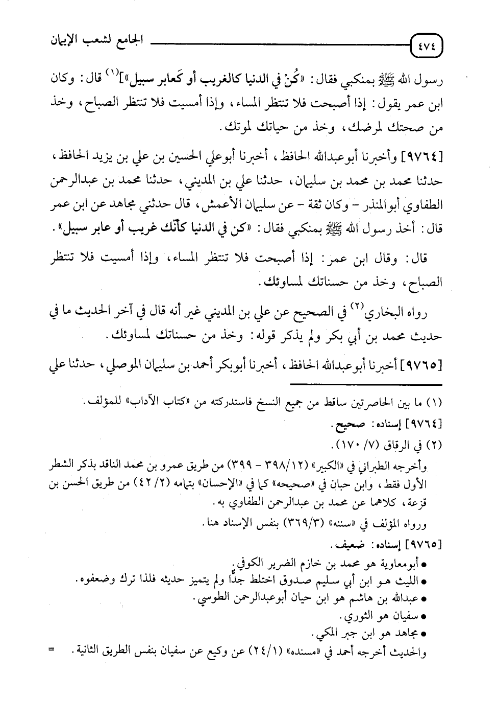 9764 - وَأَخْبَرَنَا أَبُو عَبْدِ اللهِ الْحَافِظُ , نَا أَبُو عَلِيٍّ الْحُسَيْنُ بْنُ عَلِيِّ بْنِ يَزِيدَ الْحَافِظُ , نَا مُحَمَّدُ بْنُ مُحَمَّدِ بْنِ سُلَيْمَانَ , نَا عَلِيُّ بْنُ الْمَدِينِيِّ , نَا مُحَمَّدُ بْنُ عَبْدِ الرَّحْمَنِ الطُّفَاوِيُّ أَبُو الْمُنْذِرِ وَكَانَ ثِقَةً , عَنْ سُلَيْمَانَ الْأَعْمَشِ قَالَ: حَدَّثَنِي مُجَاهِدٌ , عَنِ ابْنِ عُمَرَ قَالَ: أَخَذَ رَسُولُ اللهِ صَلَّى اللَّهُ عَلَيْهِ وَسَلَّمَ بِمَنْكِبِي , فَقَالَ: §" كُنْ فِي الدُّنْيَا كَأَنَّكَ غَرِيبٌ أَوْ عَابِرُ سَبِيلٍ " قَالَ: وَقَالَ ابْنُ عُمَرَ: " إِذَا أَصْبَحْتَ فَلَا تَنْتَظِرِ الْمَسَاءَ , وَإِذَا أَمْسَيْتَ فَلَا تَنْتَظِرِ الصَّبَاحَ , وَخُذْ مِنْ حَسَنَاتِكَ لِمَسَاوِئِكَ " رَوَاهُ الْبُخَارِيُّ فِي الصَّحِيحِ , عَنْ عَلِيِّ بْنِ الْمَدِينِيِّ , غَيْرَ أَنَّهُ قَالَ فِي آخِرِ الْحَدِيثِ: مَا فِي حَدِيثِ مُحَمَّدِ بْنِ أَبِي بَكْرٍ , وَلَمْ يَذْكُرْ قَوْلَهُ: " وَخُذْ مِنْ حَسَنَاتِكَ لِمَسَاوِئِكَ "