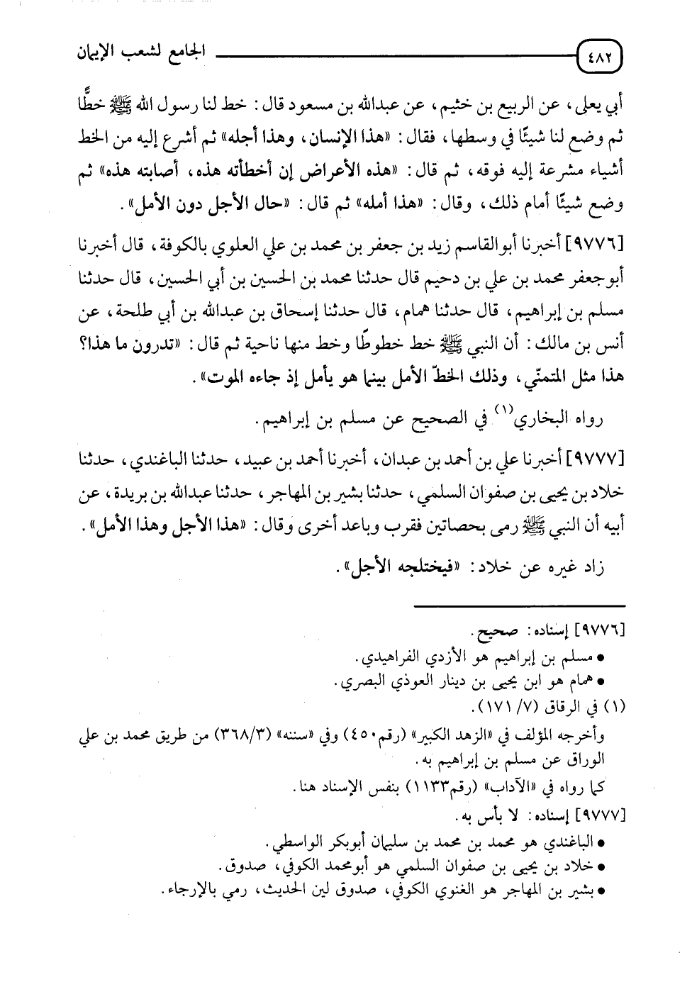 9776 - أَخْبَرَنَا أَبُو الْقَاسِمِ زَيْدُ بْنُ جَعْفَرِ بْنِ مُحَمَّدِ بْنِ عَلِيٍّ الْعَلَوِيُّ بِالْكُوفَةِ , قَالَ: أَنَا أَبُو جَعْفَرٍ مُحَمَّدُ بْنُ عَلِيِّ بْنِ دُحَيْمٍ , قَالَ: نَا مُحَمَّدُ بْنُ الْحُسَيْنِ بْنِ أَبِي الْحُنَيْنِ , قَالَ: نَا مُسْلِمُ بْنُ إِبْرَاهِيمَ , قَالَ: نَا هَمَّامٌ , قَالَ: نَا إِسْحَاقُ بْنُ عَبْدِ اللهِ بْنِ أَبِي طَلْحَةَ , عَنْ أَنَسِ بْنِ مَالِكٍ , أَنَّ النَّبِيَّ صَلَّى اللَّهُ عَلَيْهِ وَسَلَّمَ خَطَّ خُطُوطًا وَخَطَّ مِنْهَا نَاحِيَةً ثُمَّ قَالَ: §" تَدْرُونَ مَا هَذَا؟ هَذَا مِثْلُ الْمُتَمَنِّي وَذَلِكَ الْخَطُّ الْأَمَلُ بَيْنَهُمَا هُوَ يَأْمَلُ إِذْ جَاءَهُ الْمَوْتُ " رَوَاهُ الْبُخَارِيُّ فِي الصَّحِيحِ , عَنْ مُسْلِمِ بْنِ إِبْرَاهِيمَ