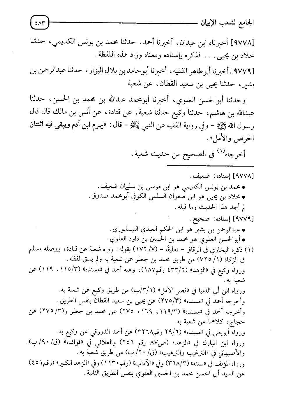 9779 - أَخْبَرَنَا أَبُو طَاهِرٍ الْفَقِيهُ , أَنَا أَبُو حَامِدِ بْنُ بِلَالٍ الْبَزَّازُ , نَا عَبْدُ الرَّحْمَنِ بْنُ بِشْرٍ , نَا يَحْيَى بْنُ سَعِيدٍ الْقَطَّانُ , عَنْ شُعْبَةَ , وَحَدَّثَنَا أَبُو الْحَسَنِ الْعَلَوِيُّ , أَنَا أَبُو مُحَمَّدٍ عَبْدُ اللهِ بْنُ مُحَمَّدِ بْنِ الْحَسَنِ , نَا عَبْدُ اللهِ بْنُ هَاشِمٍ , نَا وَكِيعٌ , نَا شُعْبَةُ , عَنْ قَتَادَةَ , عَنْ أَنَسِ بْنِ مَالِكٍ قَالَ: قَالَ رَسُولُ اللهِ صَلَّى اللَّهُ عَلَيْهِ وَسَلَّمَ , وَفِي رِوَايَةِ الْفَقِيهِ: عَنِ النَّبِيِّ صَلَّى اللَّهُ عَلَيْهِ وَسَلَّمَ قَالَ: " §يَهْرَمُ ابْنُ آدَمَ وَيَبْقَى اثْنَتَانِ: الْحِرْصُ وَالْأَمَلُ " أَخْرَجَاهُ فِي الصَّحِيحِ مِنْ حَدِيثِ شُعْبَةَ