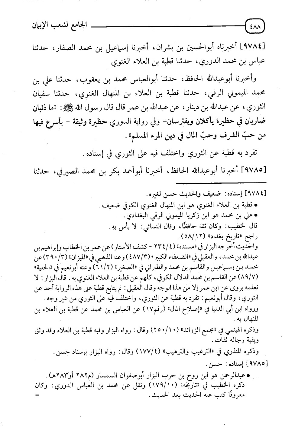 9784 - أَخْبَرَنَاهُ أَبُو الْحُسَيْنِ بْنُ بُشْرَانَ , أَنَا إِسْمَاعِيلُ بْنُ مُحَمَّدٍ الصَّفَّارُ , نَا الْعَبَّاسُ بْنُ مُحَمَّدٍ الدُّورِيُّ , نَا قُطْبَةُ بْنُ الْعَلَاءِ الْغَنَوِيُّ , وَأَخْبَرَنَا أَبُو عَبْدِ اللهِ الْحَافِظُ , نَا أَبُو الْعَبَّاسِ مُحَمَّدُ بْنُ يَعْقُوبَ , نَا عَلِيُّ بْنُ مُحَمَّدٍ الْمَيْمُونِيُّ الرَّقِّيُّ , نَا قُطْبَةُ بْنُ الْعَلَاءِ بْنِ الْمِنْهَالِ الْغَنَوِيُّ , نَا سُفْيَانُ الثَّوْرِيُّ , عَنْ عَبْدِ اللهِ بْنِ دِينَارٍ , عَنْ عَبْدِ اللهِ بْنِ عُمَرَ قَالَ: قَالَ رَسُولُ اللهِ صَلَّى اللَّهُ عَلَيْهِ وَسَلَّمَ: §" مَا ذِئْبَانِ ضَارِيَانِ فِي حَظِيرَةٍ يَأْكُلَانِ وَيَفْتَرِسَانِ " " وَفِي رِوَايَةِ الدُّورِيِّ: " حَظِيرَةٍ وَسِعَةٍ " بِأَسْرَعَ فِيهَا مِنْ حُبِّ الشَّرَفِ وَحُبِّ الْمَالِ فِي دِينِ الْمَرْءِ الْمُسْلِمِ " تَفَرَّدَ بِهِ قُطْبَةُ , عَنِ الثَّوْرِيِّ , وَاخْتَلَفَ فِيهِ عَلَى الثَّوْرِيِّ فِي إِسْنَادِهِ " ,