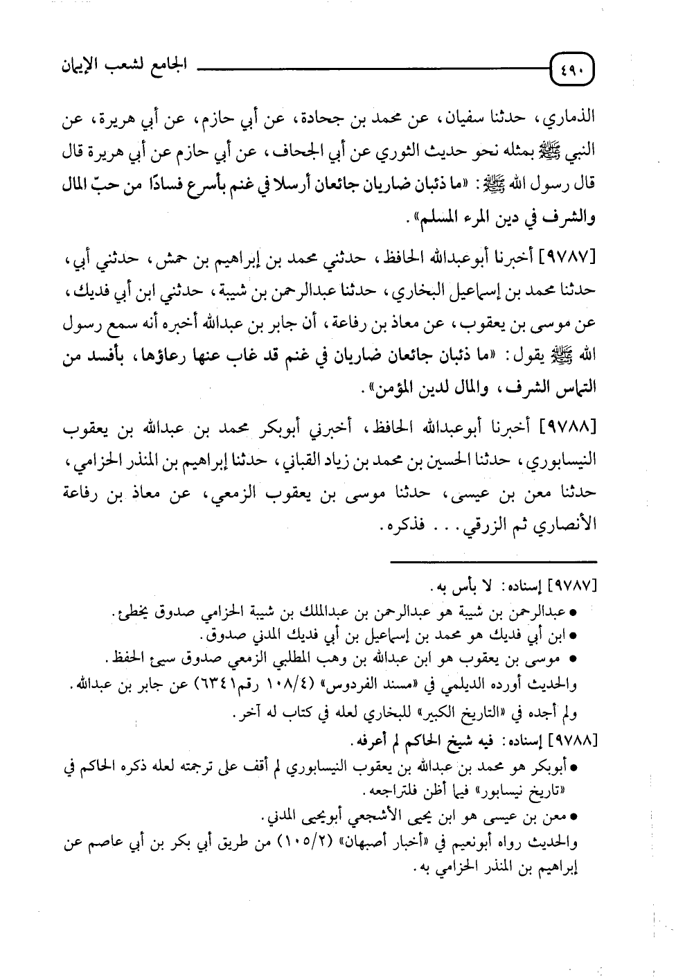 9787 - أَخْبَرَنَا أَبُو عَبْدِ اللهِ الْحَافِظُ , حَدَّثَنِي مُحَمَّدُ بْنُ إِبْرَاهِيمَ بْنِ حَمْشٍ , حَدَّثَنِي أَبِي , نَا مُحَمَّدُ بْنُ إِسْمَاعِيلَ الْبُخَارِيُّ , نَا عَبْدُ الرَّحْمَنِ بْنُ شَيْبَةَ , حَدَّثَنِي ابْنُ أَبِي فُدَيْكٍ , عَنْ مُوسَى بْنِ يَعْقُوبَ , عَنْ مُعَاذِ بْنِ رِفَاعَةَ: أَنَّ جَابِرَ بْنَ عَبْدِ اللهِ , أَخْبَرَهُ , أَنَّهُ سَمِعَ رَسُولَ اللهِ صَلَّى اللَّهُ عَلَيْهِ وَسَلَّمَ يَقُولُ: §" مَا ذِئْبَانِ جَائِعَانِ ضَارِيَانِ فِي غَنَمٍ قَدْ غَابَ عَنْهَا رِعَاؤُهَا بِأَفْسَدَ فِيهَا مِنَ الْتِمَاسِ الشَّرَفِ وَالْمَالِ لِدَيْنٍ الْمُؤْمِنِ " ,