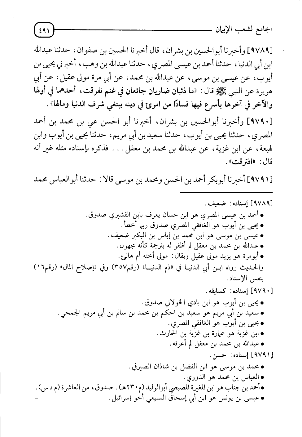 9789 - وَأَخْبَرَنَا أَبُو الْحُسَيْنِ بْنُ بِشْرَانَ , قَالَ: أَنَا الْحُسَيْنُ بْنُ صَفْوَانَ , نَا عَبْدُ اللهِ بْنُ أَبِي الدُّنْيَا , نَا أَحْمَدُ بْنُ عِيسَى الْمِصْرِيُّ , نَا عَبْدُ اللهِ بْنُ وَهْبٍ , أَخْبَرَنِي نَا يَحْيَى بْنُ أَيُّوبَ , عَنْ عِيسَى بْنِ مُوسَى , عَنْ عَبْدِ اللهِ بْنِ مُحَمَّدٍ , عَنْ أَبِي مُرَّةَ , مَوْلَى عُقَيْلٍ , عَنْ أَبِي هُرَيْرَةَ , عَنِ النَّبِيِّ صَلَّى اللَّهُ عَلَيْهِ وَسَلَّمَ: §" مَا ذِئْبَانِ ضَارِيَانِ جَائِعَانِ فِي غَنَمٍ تَفَرَّقَتْ أَحَدُهُمَا فِي أَوَّلِهَا وَالْآخَرُ فِي آخِرِهَا بِأَسْرَعَ فِيهَا فَسَادًا مِنِ امْرِئٍ فِي دِينِهِ يَبْتَغِي شَرَفَ الدُّنْيَا وَمَالَهَا " ,