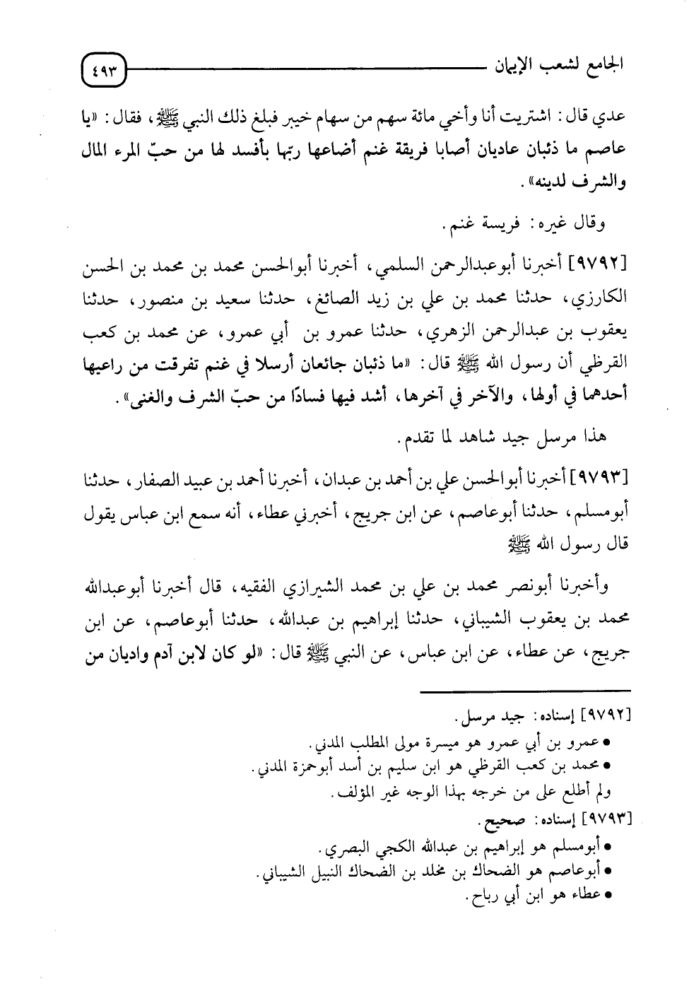 9792 - أَخْبَرَنَا أَبُو عَبْدِ الرَّحْمَنِ السَّلَمِيُّ , أَنَا أَبُو الْحَسَنِ مُحَمَّدُ بْنُ مُحَمَّدِ بْنِ الْحَسَنِ الْكَارِزِيُّ نَا مُحَمَّدُ بْنُ عَلِيِّ بْنِ زَيْدٍ الصَّائِغُ , نَا سَعِيدُ بْنُ مَنْصُورٍ , نَا يَعْقُوبُ بْنُ عَبْدِ الرَّحْمَنِ الزُّهْرِيُّ , نَا عَمْرُو بْنُ أَبِي عَمْرٍو , عَنْ مُحَمَّدِ بْنِ كَعْبٍ الْقُرَظِيُّ , أَنَّ رَسُولَ اللهِ صَلَّى اللَّهُ عَلَيْهِ وَسَلَّمَ قَالَ: §" مَا ذِئْبَانِ جَائِعَانِ أُرْسِلَا فِي غَنَمٍ تَفَرَّقَتْ مِنْ رَاعِيَهَا , أَحَدُهُمَا فِي أَوَّلِهَا وَالْآخَرُ فِي آخِرِهَا أَشَدَّ فِيهَا فَسَادًا مِنْ حُبِّ الشَّرَفِ وَالْغِنَى " " هَذَا مُرْسَلٌ جَيِّدٌ شَاهِدٌ لَمَا تَقَدَّمَ "