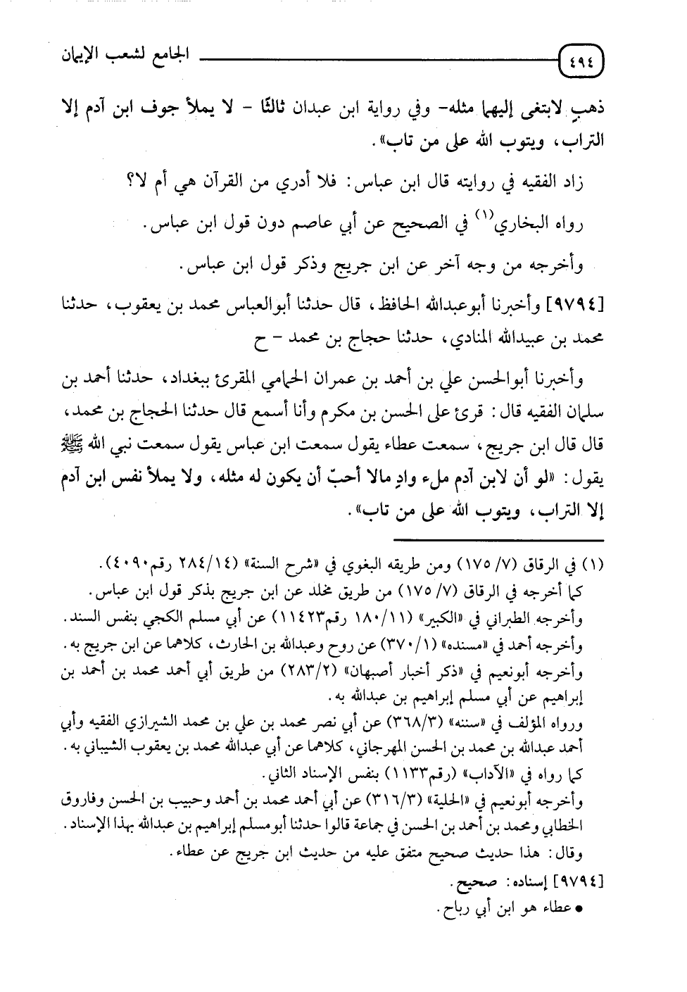 9794 - وَأَخْبَرَنَا أَبُو عَبْدِ اللهِ الْحَافِظُ , قَالَ: نَا أَبُو الْعَبَّاسِ مُحَمَّدُ بْنُ يَعْقُوبَ , نَا مُحَمَّدُ بْنُ عُبَيْدِ اللهِ الْمُنَادِي , نَا حَجَّاجُ بْنُ مُحَمَّدٍ , ح , وَأَخْبَرَنَا أَبُو الْحَسَنِ عَلِيُّ بْنُ أَحْمَدَ بْنِ عُمَرَ الْحَمَّامِيُّ الْمُقْرِئُ , بِبَغْدَادَ , أَنَا أَحْمَدُ بْنُ سَلْمَانَ الْفَقِيهُ , قَالَ: قُرِئَ عَلَى الْحَسَنِ بْنِ مُكْرَمٍ وَأَنَا أَسْمَعُ , قَالَ: نَا حَجَّاجُ بْنُ مُحَمَّدٍ , قَالَ: قَالَ ابْنُ جُرَيْجُ: سَمِعْتُ عَطَاءً يَقُولُ: سَمِعْتُ ابْنَ عَبَّاسٍ يَقُولُ: سَمِعْتُ نَبِيَّ اللهِ صَلَّى اللَّهُ عَلَيْهِ وَسَلَّمَ يَقُولُ: §" لَوْ أَنَّ لِابْنِ آدَمَ مِلْءُ وَادً مَالًا أَحَبَّ أَنْ يَكُونَ لَهُ مِثْلُهُ , وَلَا يَمْلَأُ نَفْسَ ابْنِ آدَمَ إِلَّا التُّرَابُ , وَيَتُوبُ اللهُ عَلَى مَنْ تَابَ " , -[495]- قَالَ: فَقَالَ ابْنُ عَبَّاسٍ: " فَلَا أَدْرِي فِي الْقُرْآنِ هُوَ أَمْ لَا ". لَفْظُ حَدِيثِ الْمُقْرِئِ رَوَاهُ مُسْلِمٌ فِي الصَّحِيحِ , عَنْ زُهَيْرِ بْنِ حَرْبٍ وَغَيْرِهِ , عَنْ حَجَّاجِ بْنِ مُحَمَّدٍ