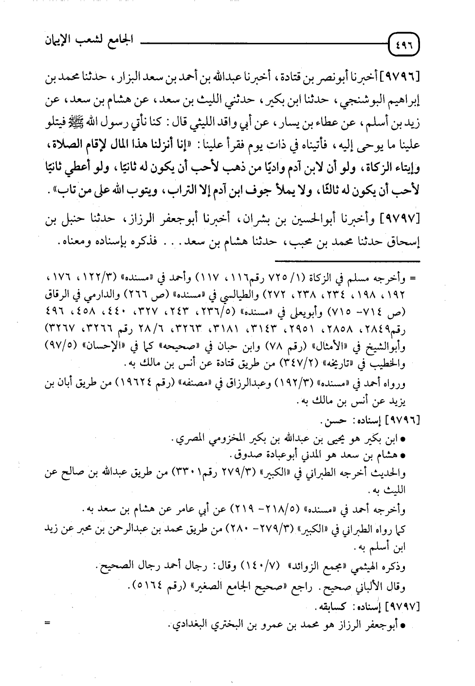 9796 - أَخْبَرَنَا أَبُو نَصْرِ بْنُ قَتَادَةَ , أَنَا عَبْدُ اللهِ بْنُ أَحْمَدَ بْنِ سَعْدٍ الْبَزَّازُ , نَا مُحَمَّدُ بْنُ إِبْرَاهِيمَ الْبُوشَنْجِيُّ , نَا ابْنُ بُكَيْرٍ , حَدَّثَنِي اللَّيْثُ بْنُ سَعْدٍ , عَنْ هِشَامِ بْنِ سَعْدٍ , عَنْ زَيْدِ بْنِ أَسْلَمَ , عَنْ عَطَاءِ بْنِ يَسَارٍ , عَنْ أَبِي وَاقِدٍ اللَّيْثِيِّ قَالَ: كُنَّا نَأْتِي رَسُولَ اللهِ صَلَّى اللَّهُ عَلَيْهِ وَسَلَّمَ فَيَتْلُو عَلَيْنَا مَا يُوحَى إِلَيْهِ , فَأَتَيْنَاهُ فِي ذَاتِ يَوْمٍ فَقَرَأَ عَلَيْنَا: §" إِنَّا أَنْزَلْنَا هَذَا الْمَالَ لِإِقَامِ الصَّلَاةِ , وَإِيتَاءِ الزَّكَاةِ , وَلَوْ أَنَّ لِابْنِ آدَمَ وَادِيًا مِنْ ذَهَبٍ لَأَحَبَّ أَنْ يَكُونَ لَهُ ثَانٍ , وَلَوْ أُعْطِيَ ثَانِيًا لَأَحَبَّ أَنْ يَكُونَ لَهُ ثَالِثٌ , وَلَا يَمْلَأُ جَوْفَ ابْنِ آدَمَ إِلَّا التُّرَابُ , وَيَتُوبُ اللهُ عَلَى مَنْ تَابَ " ,