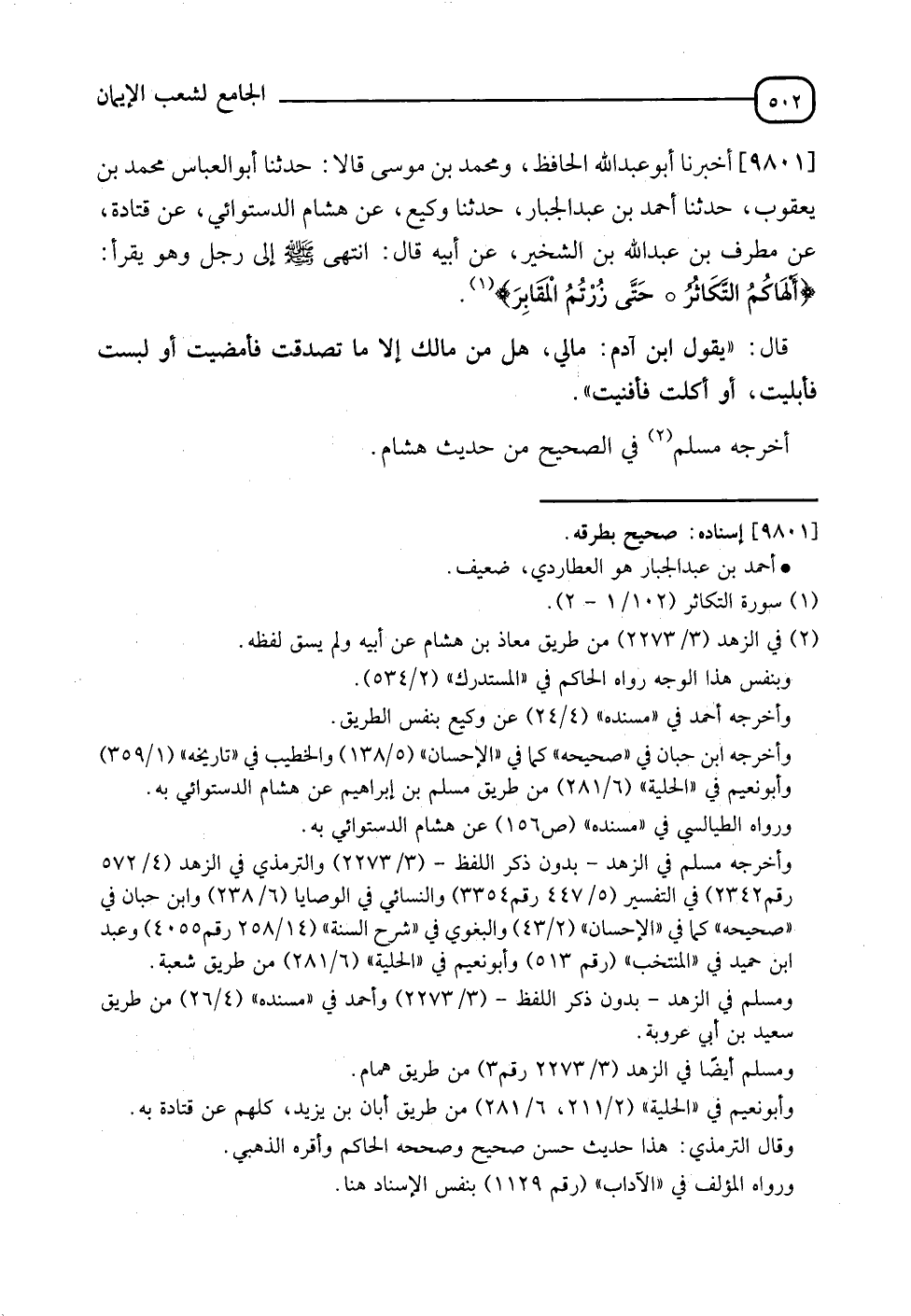 9801 - أَخْبَرَنَا أَبُو عَبْدِ اللهِ الْحَافِظُ , وَمُحَمَّدُ بْنُ مُوسَى , قَالَا: نَا أَبُو الْعَبَّاسِ مُحَمَّدُ بْنُ يَعْقُوبَ , نَا أَحْمَدُ بْنُ عَبْدِ الْجَبَّارِ , نَا وَكِيعٌ , عَنْ هِشَامٍ الدُّسْتُوائِيُّ , عَنْ قَتَادَةَ , عَنْ مُطَرِّفِ بْنِ عَبْدِ اللهِ بْنِ الشِّخِّيرِ , عَنْ أَبِيهِ قَالَ: انْتَهَى النَّبِيُّ صَلَّى اللَّهُ عَلَيْهِ وَسَلَّمَ إِلَى رَجُلٍ وَهُوَ يَقْرَأُ: {أَلْهَاكُمُ التَّكَاثُرُ حَتَّى زُرْتُمُ الْمَقَابِرَ} [التكاثر: 2] , قَالَ: " §يَقُولُ ابْنُ آدَمَ: مَالِي. هَلْ لَكَ مِنْ مَالِكَ إِلَّا مَا تَصَدَّقْتَ فَأَمْضَيْتَ أَوْ لَبِسْتَ فَأَبْلَيْتَ أَوْ أَكَلْتَ فَأَفْنَيْتَ " أَخْرَجَهُ مُسْلِمٌ فِي الصَّحِيحِ مِنْ حَدِيثِ هِشَامٍ