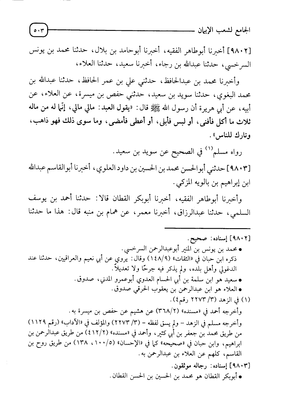 9802 - أَخْبَرَنَا أَبُو طَاهِرٍ الْفَقِيهُ , أَنَا أَبُو حَامِدِ بْنُ بِلَالٍ , نَا مُحَمَّدُ بْنُ يُونُسَ السَّرَخْسِيُّ , نَا عَبْدُ اللهِ بْنُ رَجَاءٍ , أَنَا سَعِيدٌ , نَا الْعَلَاءُ , وَأَخْبَرَنَا مُحَمَّدُ بْنُ عَبْدِ اللهِ الْحَافِظُ , حَدَّثَنِي عَلِيُّ بْنُ عُمَرَ الْحَافِظُ , نَا عَبْدُ اللهِ بْنُ مُحَمَّدٍ الْبَغَوِيُّ , نَا سُوَيْدُ بْنُ سَعِيدٍ , حَدَّثَنِي حَفْصُ بْنُ مَيْسَرَةَ , عَنِ الْعَلَاءِ , عَنْ أَبِيهِ , عَنْ أَبِي هُرَيْرَةَ , أَنَّ رَسُولَ اللهِ صَلَّى اللَّهُ عَلَيْهِ وَسَلَّمَ قَالَ: " §يَقُولُ الْعَبْدُ: مالِي مَالِي , إِنَّمَا لَهُ مِنْ مَالِهِ ثَلَاثٌ: مَا أَكَلَ فَأَفْنَى أَوْ لَبِسَ فَأَبْلَى أَوْ أَعْطَى فَأَمْضَى , وَمَا سِوَى ذَلِكَ فَهُوَ ذَاهِبٌ وَتَارِكٌ لِلنَّاسِ " رَوَاهُ مُسْلِمٌ فِي الصَّحِيحِ عَنْ سُوَيْدِ بْنِ سَعِيدٍ