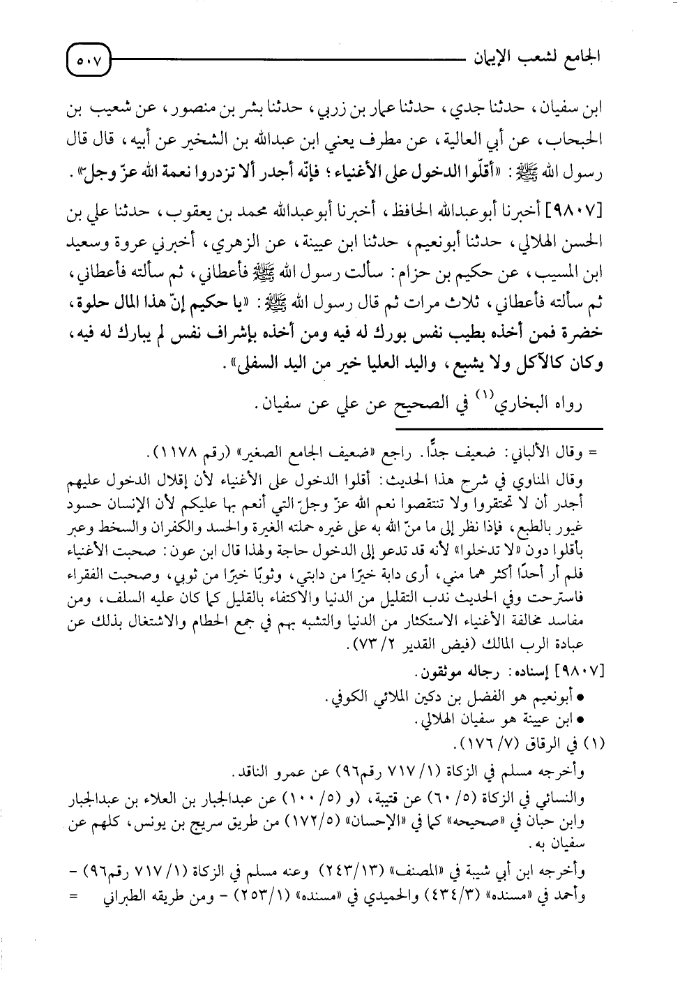 9807 - أَخْبَرَنَا أَبُو عَبْدِ اللهِ الْحَافِظُ , أَنَا أَبُو عَبْدِ اللهِ مُحَمَّدُ بْنُ يَعْقُوبَ , نَا عَلِيُّ بْنُ الْحَسَنِ الْهِلَالِيُّ , نَا أَبُو نُعَيْمٍ , نَا ابْنُ عُيَيْنَةَ , عَنِ الزُّهْرِيِّ , أَخْبَرَنِي عُرْوَةُ , وَسَعِيدُ بْنُ الْمُسَيِّبِ , عَنْ حَكِيمِ بْنِ حِزَامٍ , سَأَلْتُ رَسُولَ اللهِ صَلَّى اللَّهُ عَلَيْهِ وَسَلَّمَ فَأَعْطَانِي , ثُمَّ سَأَلْتُهُ فَأَعْطَانِي , ثُمَّ سَأَلْتُهُ فَأَعْطَانِي ثَلَاثَ مَرَّاتٍ , ثُمَّ قَالَ رَسُولُ اللهِ صَلَّى اللَّهُ عَلَيْهِ وَسَلَّمَ: " يَا حَكِيمُ , إِنَّ §هَذَا الْمَالَ حُلْوَةٌ خَضِرَةٌ , فَمَنْ أَخَذَهُ بِطِيبِ نَفْسٍ بُورِكَ لَهُ فِيهِ , وَمَنْ أَخَذَهُ بِإِشْرَافِ نَفْسٍ لَمْ يُبَارَكْ لَهُ فِيهِ , وَكَانَ كَالْآكِلِ وَلَا يَشْبَعُ , وَالْيَدُ الْعُلْيَا خَيْرٌ مِنَ الْيَدِ السُّفْلَى " رَوَاهُ الْبُخَارِيُّ فِي الصَّحِيحِ , عَنْ عَلِيٍّ , عَنْ سُفْيَانَ