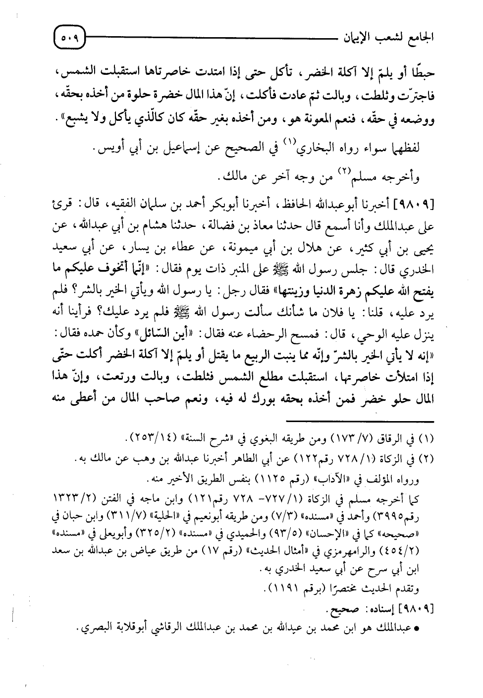 9809 - أَخْبَرَنَا أَبُو عَبْدِ اللهِ الْحَافِظُ , أَنَا أَبُو بَكْرٍ أَحْمَدُ بْنُ سَلْمَانَ الْفَقِيهُ , قَالَ: قُرِئَ عَلَى عَبْدِ الْمَلِكِ وَأَنَا أَسْمَعُ , قَالَ: نَا مُعَاذُ بْنُ فَضَالَةَ , نَا هِشَامُ بْنُ أَبِي عَبْدِ اللهِ , عَنْ يَحْيَى بْنِ أَبِي كَثِيرٍ , عَنْ هِلَالِ بْنِ أَبِي مَيْمُونَةَ , عَنْ عَطَاءِ بْنِ يَسَارٍ , عَنْ أَبِي سَعِيدٍ الْخُدْرِيِّ قَالَ: جَلَسَ رَسُولُ اللهِ صَلَّى اللَّهُ عَلَيْهِ وَسَلَّمَ عَلَى الْمِنْبَرَ ذَاتَ يَوْمٍ فَقَالَ: " إِنَّ مِمَّا أَتَخَوَّفُ عَلَيْكُمْ مَا يَفْتَحُ اللهُ عَلَيْكُمْ مِنْ زَهْرَةِ الدُّنْيَا وَزِينَتِهَا " فَقَالَ رَجُلٌ: يَا رَسُولَ اللهِ , وَيَأْتِي الْخَيْرُ بِالشَّرِّ؟ فَلَمْ يَرُدَّ عَلَيْهِ. قُلْنَا: يَا فُلَانُ , مَا شَأْنُكَ سَأَلْتَ رَسُولَ اللهِ صَلَّى اللَّهُ عَلَيْهِ وَسَلَّمَ فَلَمْ يَرُدَّ عَلَيْكَ , فَرَأَيْنَا أَنَّهُ يَنْزِلُ عَلَيْهِ الْوَحْيُ , قَالَ: فَمَسَحَ الرُّحَضَاءَ عَنْهُ فَقَالَ: " أَيْنَ السَّائِلُ؟ " وَكَأَنَّهُ حَمِدَهُ فَقَالَ: " إِنَّهُ §لَا يَأْتِي الْخَيْرُ بِالشَّرِّ , وَإِنَّهُ مِمَّا يُنْبِتُ الرَّبِيعُ مَا يَقْتُلُ أَوْ يُلِمُّ إِلَّا أَكَلَةُ الْخَضِرِ أَكَلَتْ حَتَّى إِذَا امْتَلَأَتْ خَاصِرَتُهَا اسْتَقْبَلَتْ مَطْلِعَ الشَّمْسَ , فَثَلَطَتْ وَبَالَتْ وَرَتَعَتْ , وَإِنَّ هَذَا الْمَالَ حُلْوٌ خَضِرٍ فَمَنْ أَخَذَهُ بِحَقِّهِ بُورِكَ لَهُ فِيهِ , وَنِعْمَ صَاحِبُ الْمَالِ مَنْ أُعْطِيَ مِنْهُ -[510]- الْمِسْكِينُ وَالْيَتِيمُ وَابْنُ السَّبِيلِ " أَوْ كَمَا قَالَ رَسُولُ اللهِ صَلَّى اللَّهُ عَلَيْهِ وَسَلَّمَ , " وَالَّذِي يَأْخُذُ بِإِشْرَافِ نَفْسٍ كَالَّذِي يَأْكُلُ وَلَا يَشْبَعُ , فَيَكُونُ عَلَيْهِ حَسْرَةٌ يَوْمَ الْقِيَامَةِ , وَرُبَّ مُتَخَوِّضٍ فِي مَالِ اللهِ وَمَالِ رَسُولِ اللهِ , لَهُ النَّارُ يَوْمَ الْقِيَامَةِ " رَوَاهُ الْبُخَارِيُّ فِي الصَّحِيحِ عَنْ مُعَاذِ بْنِ فَضَالَةَ غَيْرَ أَنَّهُ قَالَ: فَنِعْمَ صَاحِبُ الْمُسْلِمِ مَا أَعْطَى مِنْهُ الْمِسْكِينَ وَالْيَتِيمَ وَابْنَ السَّبِيلِ وَقَالَ: " شَهِيدٌ " بَدَلَ قَوْلِهِ: " حَسْرَةٌ " وَلَمْ يَذْكُرْ مَا بَعْدَهُ