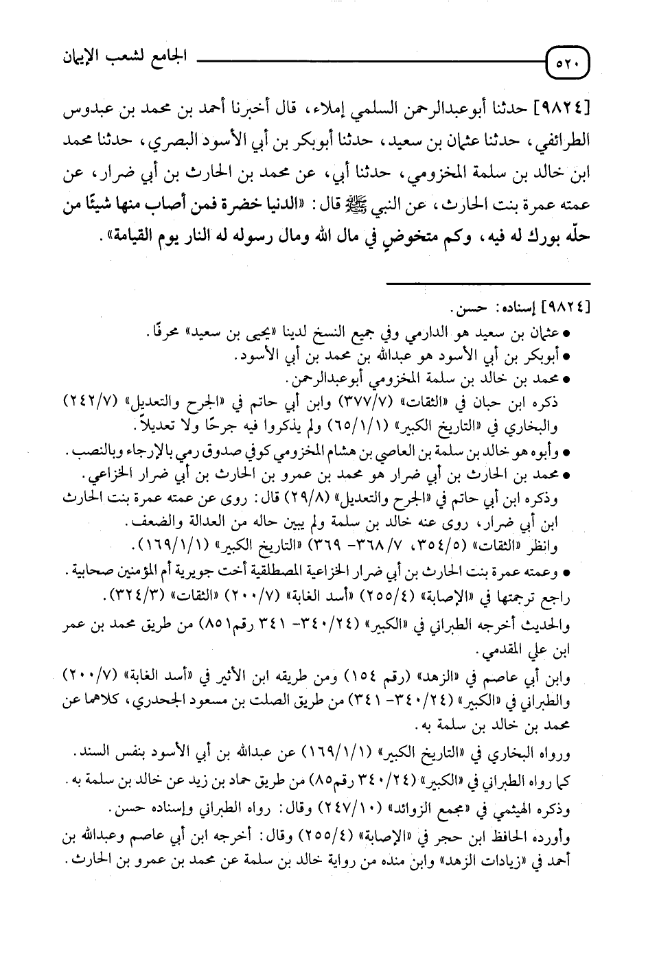9824 - حَدَّثَنَا أَبُو عَبْدِ الرَّحْمَنِ السَّلَمِيُّ , إِمْلَاءً قَالَ: أَنَا أَحْمَدُ بْنُ مُحَمَّدِ بْنِ عُبْدُوسٍ الطَّرَائِفِيُّ , نَا يَحْيَى بْنُ سَعِيدٍ , نَا أَبُو بَكْرِ بْنُ أَبِي الْأَسْوَدِ الْبَصْرِيُّ , نَا مُحَمَّدُ بْنُ خَالِدِ بْنِ سَلَمَةَ الْمَخْزُومِيُّ , نَا أَبِي , عَنْ مُحَمَّدِ بْنِ الْحَارِثِ بْنِ أَبِي ضِرَارٍ , عَنْ عَمَّتِهِ عَمْرَةَ بِنْتِ الْحَارِثِ , عَنِ النَّبِيِّ صَلَّى اللَّهُ عَلَيْهِ وَسَلَّمَ قَالَ: §" الدُّنْيَا خَضِرَةٌ حُلْوَةٌ , فَمَنْ أَصَابَ مِنْهَا شَيْئًا مِنْ حِلِّهِ بُورِكَ لَهُ فِيهَا , وَكَمْ مُتَخَوِّضٍ فِي مَالِ اللهِ وَمَالِ رَسُولِهِ لَهُ النَّارُ يَوْمَ الْقِيَامَةِ "