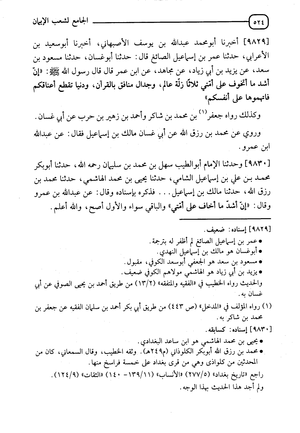 9829 - أَخْبَرَنَا أَبُو مُحَمَّدٍ عَبْدُ اللهِ بْنُ يُوسُفَ الْأَصْبَهَانِيُّ , أَنَا أَبُو سَعِيدِ بْنُ الْأَعْرَابِيِّ , نَا عُمَرُ بْنُ إِسْمَاعِيلَ الصَّائِغُ , قَالَ: نَا أَبُو عُثْمَانَ , نَا مَسْعُودُ بْنُ سَعْدٍ , عَنْ يَزِيدَ بْنِ أَبِي زِيَادٍ , عَنْ مُجَاهِدٍ , عَنِ ابْنِ عُمَرَ قَالَ: قَالَ رَسُولُ اللهِ صَلَّى اللَّهُ عَلَيْهِ وَسَلَّمَ: " إِنَّ §أَشَدَّ مَا أَتَخَوَّفُ عَلَى أُمَّتِي ثَلَاثًا: زَلَّةُ عَالِمٍ , وَجِدَالُ مُنَافِقٍ بِالْقُرْآنِ , وَدُنْيَا تَقْطَعُ أَعْنَاقَكُمْ , فَاتَّهِمُوهَا عَلَى أَنْفُسِكُمْ " وَكَذَلِكَ رَوَاهُ جَعْفَرُ بْنُ مُحَمَّدِ بْنِ شَاكِرٍ , وَأَحْمَدُ بْنُ زُهَيْرِ بْنِ حَرْبٍ , عَنْ أَبِي غَسَّانَ , وَرُوِيَ عَنْ مُحَمَّدِ بْنِ رِزْقِ اللهِ , عَنْ أَبِي غَسَّانَ مَالِكِ بْنِ إِسْمَاعِيلَ فَقَالَ: عَنْ عَبْدِ اللهِ بْنِ عَمْرٍو ,