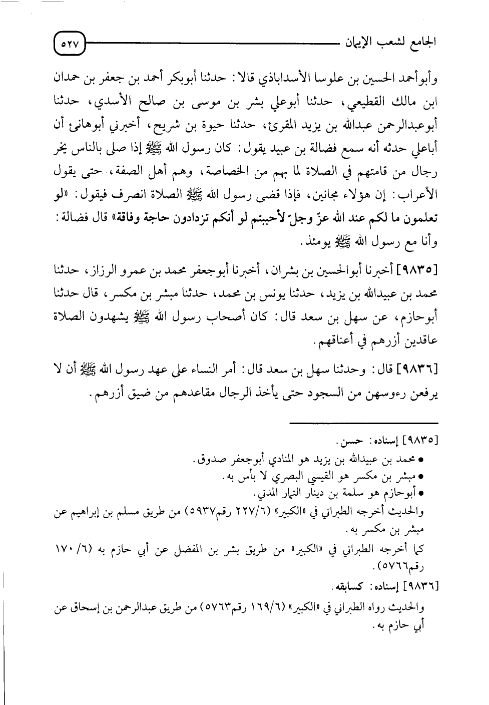 9835 - أَخْبَرَنَا أَبُو الْحُسَيْنِ بْنُ بُشْرَانَ , أَنَا أَبُو جَعْفَرٍ مُحَمَّدُ بْنُ عَمْرٍو الرَّزَّازُ , ثَنَا مُحَمَّدُ بْنُ عُبَيْدِ اللهِ بْنِ يَزِيدَ , نَا يُونُسُ بْنُ مُحَمَّدٍ , نَا مُبَشِّرُ بْنُ مُكَسِّرٍ , قَالَ: نَا أَبُو حَازِمٍ , عَنْ سَهْلِ بْنِ سَعْدٍ قَالَ: " كَانَ §أَصْحَابُ رَسُولِ اللهِ صَلَّى اللَّهُ عَلَيْهِ وَسَلَّمَ يَشْهَدُونَ الصَّلَاةَ عَاقِدِي أُزُرِهِمْ فِي أَعْنَاقِهِمْ "