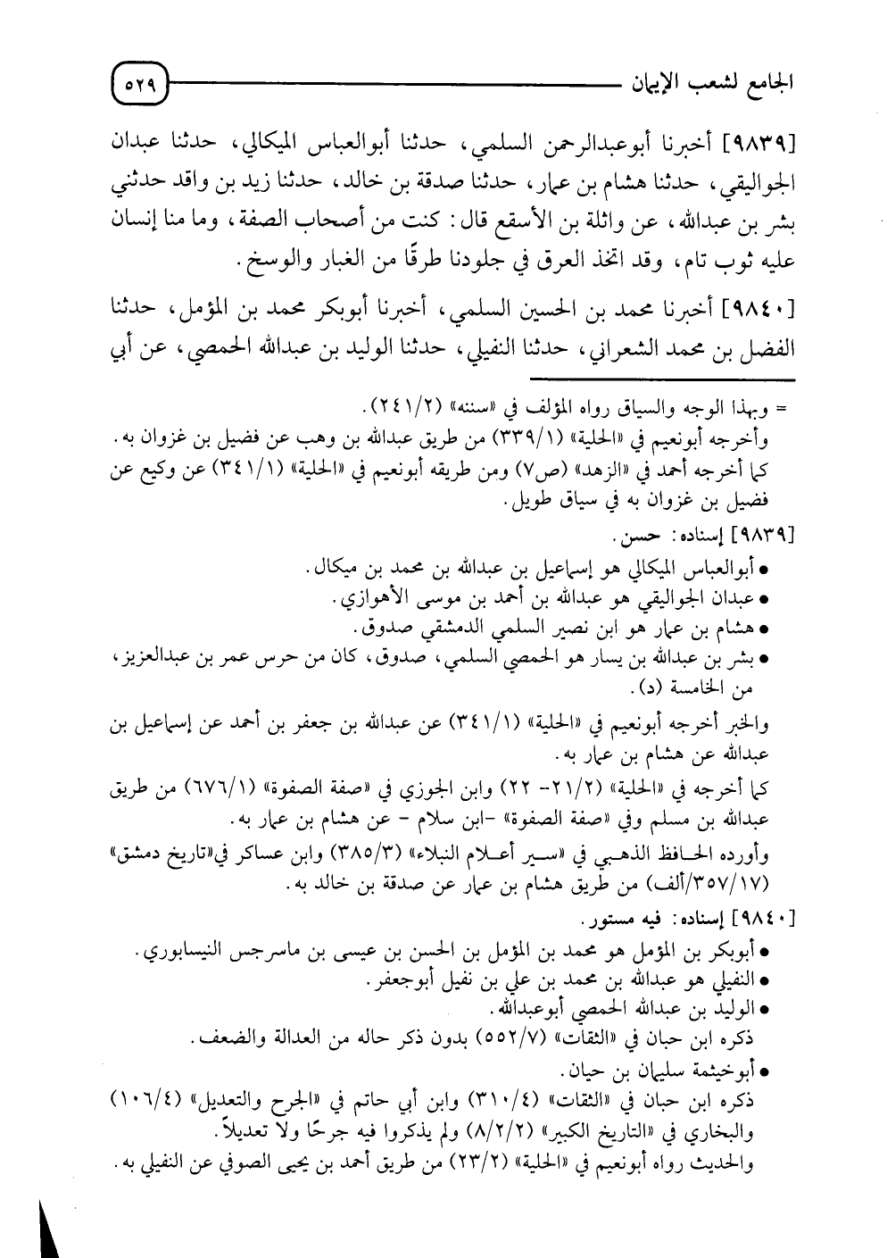 9840 - أَخْبَرَنَا مُحَمَّدُ بْنُ الْحُسَيْنِ السَّلَمِيُّ , أَنَا أَبُو بَكْرٍ مُحَمَّدُ بْنُ الْمُؤَمَّلِ , نَا الْفَضْلُ بْنُ مُحَمَّدٍ الشَّعْرَانِيُّ , نَا النُّفَيْلِيُّ , نَا الْوَلِيدُ بْنُ عَبْدِ اللهِ الْحِمْصِيُّ , عَنْ أَبِي -[530]- خَيْثَمَةَ سُلَيْمَانَ بْنِ حَيَّانَ , نَا وَاثِلَةُ بْنُ الْأَسْقَعِ قَالَ: كُنْتُ مِنْ فُقَرَاءِ الْمُصَلِّينَ مِنْ أَهْلِ الصُّفَّةِ , فَأَتَانَا النَّبِيُّ صَلَّى اللَّهُ عَلَيْهِ وَسَلَّمَ ذَاتَ يَوْمٍ فَقَالَ: §" كَيْفَ أَنْتُمْ بَعْدِي إِذَا شَبِعْتُمْ مِنْ خُبْزِ الْبُرِّ وَالزَّيْتِ , وَأَكَلْتُمْ أَلْوَانَ الطَّعَامِ , وَلَبِسْتُمْ أَنْوَاعَ الثِّيَابِ؟ فَأَنْتُمُ الْيَوْمَ خَيْرٌ أَمْ ذَاكَ؟ " قُلْنَا: أَوْ ذَاكَ , قَالَ: " بَلْ أَنْتُمُ الْيَوْمَ خَيْرٌ " قَالَ وَاثِلَةُ: " فَمَا ذَهَبَتْ بِنَا الْأَيَّامُ حَتَّى شَبِعْنَا مِنْ خُبْزِ الْبُرِّ وَالزَّيْتِ , وَأَكَلْنَا أَلْوَانَ الطَّعَامِ , وَلَبِسْنَا أَلْوَانَ الثِّيَابِ , وَرَكِبْنَا الْمَرَاكِبَ "