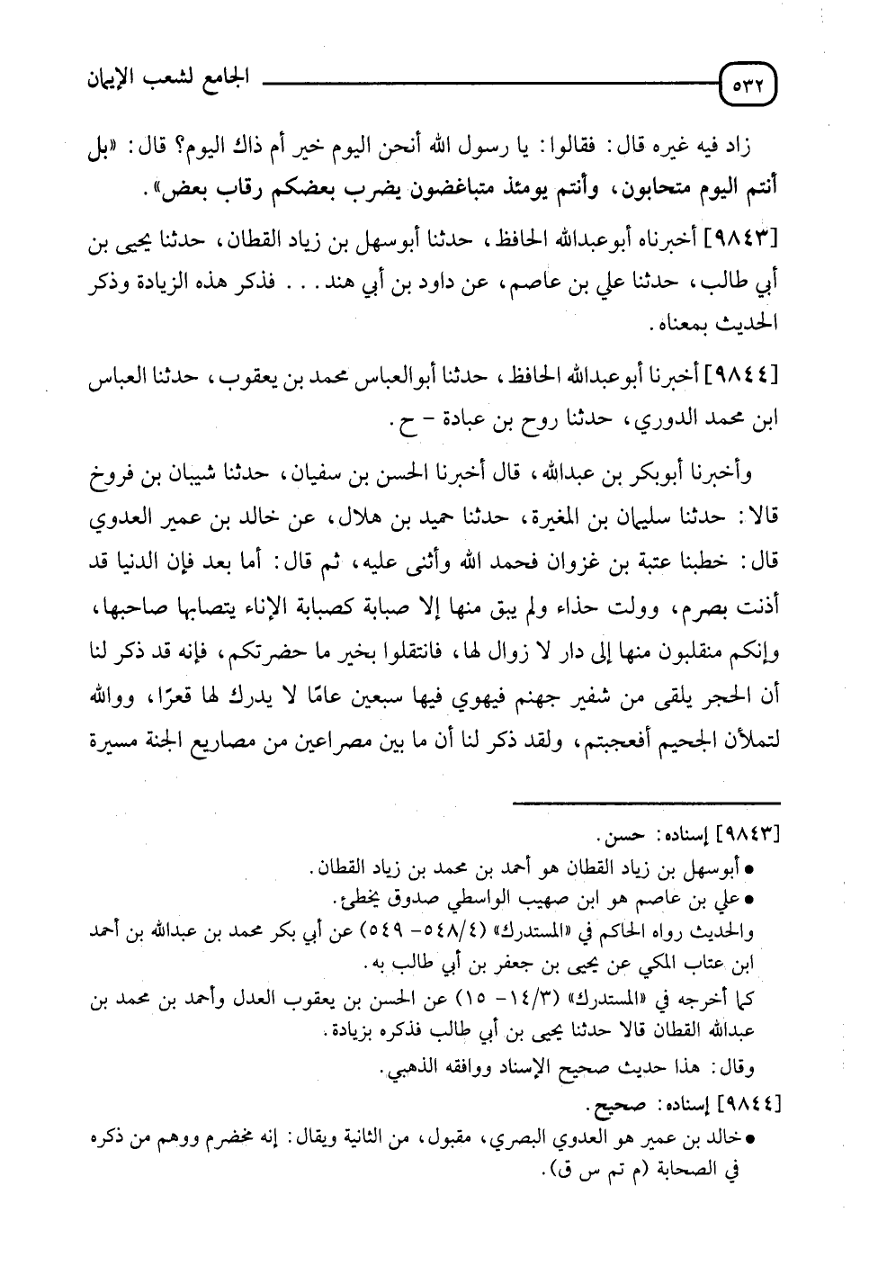 9844 - أَخْبَرَنَا أَبُو عَبْدِ اللهِ الْحَافِظُ , نَا أَبُو الْعَبَّاسِ مُحَمَّدُ بْنُ يَعْقُوبَ , نَا الْعَبَّاسُ بْنُ مُحَمَّدٍ الدُّورِيُّ , نَا رَوْحُ بْنُ عِبَادَةَ , ح وَأَخْبَرَنَا أَبُو بَكْرِ بْنُ عَبْدِ اللهِ , قَالَ: أَنَا الْحَسَنُ بْنُ سُفْيَانَ , نَا شَيْبَانُ بْنُ فَرُّوخٍ , قَالَا: نَا سُلَيْمَانُ بْنُ الْمُغِيرَةِ , نَا حُمَيْدُ بْنُ هِلَالٍ , عَنْ خَالِدِ بْنِ عُمَيْرٍ الْعَدَوِيِّ , قَالَ: خَطَبَنَا عُتْبَةُ بْنُ غَزْوَانَ , فَحَمِدَ اللهَ وَأَثْنَى عَلَيْهِ ثُمَّ قَالَ: " أَمَّا بَعْدُ , فَإِنَّ الدُّنْيَا قَدْ آذَنَتْ بِصَرْمٍ , وَوَلَّتْ حَذَّاءَ , وَلَمْ يَبْقَ مِنْهَا إِلَّا صُبَابَةٌ كَصُبَابَةِ الْإِنَاءِ يَتَصَابُّهَا صَاحِبُهَا , وَإِنَّكُمْ مُنْقَلِبُونَ مِنْهَا إِلَى دَارٍ لَا زَوَالَ لَهَا , فَانْتَقِلُوا بِخَيْرِ مَا حَضَرَتْكُمْ , فَإِنَّهُ قَدْ ذُكِرَ لَنَا أَنَّ الْحُجَرَ يُلْقَى مِنْ شَفِيرِ جَهَنَّمَ , فَيَهْوِي فِيهَا سَبْعِينَ عَامًا لَا يُدْرِكُ لَهَا قَعْرًا , وَوَاللهِ لَتُمْلَأَنَّ الْجَحِيمُ , فَعَجِبْتُمْ؟ وَلَقَدْ ذُكِرَ لَنَا أَنَّ مَا بَيْنَ مِصْرَاعَيْنِ مِنْ مَصَارِيعِ الْجَنَّةِ مَسِيرَةَ -[533]- أَرْبَعِينَ سَنَةً , وَلَيَأْتِيَنَّ عَلَيْهِ يَوْمٌ وَهُوَ كَظِيظٌ مِنَ الزِّحَامِ , وَلَقَدْ §رَأَيْتُنِي سَابِعَ سَبْعَةٍ مَعَ رَسُولِ اللهِ صَلَّى اللَّهُ عَلَيْهِ وَسَلَّمَ مَا لَنَا طَعَامٌ إِلَّا وَرَقُ الشَّجَرِ حَتَّى قَرِحَتْ أَشْدَاقُنَا , فَالْتَقَطْتُ بُرْدَةً , فَشَقَقْتُهَا بَيْنِي وَبَيْنَ سَعْدِ بْنِ مَالِكٍ , فَأْتَزَرْتُ بِبَعْضِهَا , وَأْتَزَرَ سَعْدٌ بِبَعْضِهَا , فَمَا أَصْبَحَ الْيَوْمُ مِنَّا أَحَدٌ إِلَّا أَصْبَحَ أَمِيرًا عَلَى مِصْرٍ مِنَ الْأَمْصَارِ , وَإِنِّي أَعُوذُ بِاللهِ أَنْ أَكُونَ فِي نَفْسِي عَظِيمًا وَعِنْدَ اللهِ صَغِيرًا , وَإِنَّهَا لَمْ تَكُنْ نُبُوَّةٌ قَطُّ إِلَّا تَنَاسَخَتْ حَتَّى يَكُونَ آخِرُ عَاقِبَتِهَا مُلْكًا وَسَتُجَرِّبُونَ الْأُمَرَاءَ بَعْدِي " رَوَاهُ مُسْلِمٌ فِي الصَّحِيحِ , عَنْ شَيْبَانَ بْنِ فَرُّوخٍ