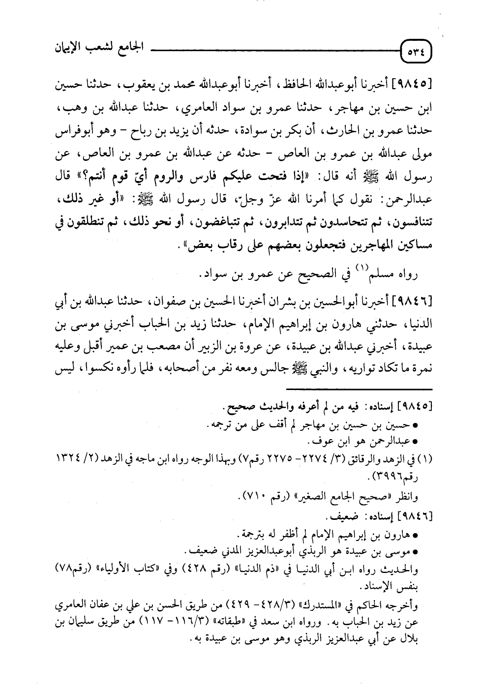 9845 - أَخْبَرَنَا أَبُو عَبْدِ اللهِ الْحَافِظُ , أَنَا أَبُو عَبْدِ اللهِ مُحَمَّدُ بْنُ يَعْقُوبَ , نَا حُسَيْنُ بْنُ حَسَنِ بْنِ مُهَاجِرٍ , نَا عَمْرُو بْنُ سَوَادٍ الْعَامِرِيُّ , نَا عَبْدُ اللهِ بْنُ وَهْبٍ , أَنَا عَمْرُو بْنُ الْحَارِثِ , أَنَّ بَكْرَ بْنَ سَوَادَةَ , حَدَّثَهُ أَنَّ يَزِيدَ بْنَ رَبَاحٍ وَهُوَ أَبُو فِرَاسٍ مَوْلَى عَبْدِ اللهِ بْنِ عَمْرِو بْنِ الْعَاصِ حَدَّثَهُ , عَنْ عَبْدِ اللهِ بْنِ عَمْرِو بْنِ الْعَاصِ , عَنْ رَسُولِ اللهِ صَلَّى اللَّهُ عَلَيْهِ وَسَلَّمَ أَنَّهُ قَالَ: §" إِذَا فُتِحَتْ عَلَيْكُمْ فَارِسُ وَالرُّومُ , أَيُّ قَوْمٍ أَنْتُمْ؟ " , قَالَ عَبْدُ الرَّحْمَنِ: نَقُولُ كَمَا أَمَرَنَا اللهُ عَزَّ وَجَلَّ. فَقَالَ رَسُولُ اللهِ صَلَّى اللَّهُ عَلَيْهِ وَسَلَّمَ: " أَوْ غَيْرُ ذَلِكَ تَتَنَافَسُونَ ثُمَّ تَتَحَاسَدُونَ , ثُمَّ تَتَدَابَرُونَ ثُمَّ تَتَبَاغَضُونَ , أَوْ نَحْوَ ذَلِكَ , ثُمَّ تَنْطَلِقُونَ فِي مَسَاكِنِ الْمُهَاجِرِينَ فَتَجْعَلُونَ بَعْضَهُمْ عَلَى رِقَابِ بَعْضٍ " رَوَاهُ مُسْلِمٌ فِي الصَّحِيحِ , عَنْ عَمْرِو بْنِ سَوَادٍ