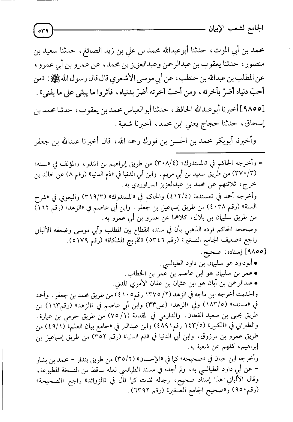9855 - أَخْبَرَنَا أَبُو عَبْدِ اللهِ الْحَافِظُ , نَا أَبُو الْعَبَّاسِ مُحَمَّدُ بْنُ يَعْقُوبَ , نَا مُحَمَّدُ بْنُ إِسْحَاقَ , نَا حَجَّاجٌ يَعْنِي ابْنَ مُحَمَّدٍ , أَنَا شُعْبَةُ , وَأَخْبَرَنَا أَبُو بَكْرٍ مُحَمَّدُ بْنُ الْحَسَنِ بْنِ فُورَكٍ رَحِمَهُ اللهُ , قَالَ: أَنَا عَبْدُ اللهِ بْنُ جَعْفَرٍ -[540]- الْأَصْبَهَانِيُّ , نَا يُونُسُ بْنُ حَبِيبٍ , نَا أَبُو دَاوُدَ , نَا شُعْبَةُ , عَنْ عُمَرَ بْنِ سُلَيْمَانَ , عَنْ عَبْدِ الرَّحْمَنِ بْنِ أَبَانَ , عَنْ أَبِيهِ , عَنْ زَيْدِ بْنِ ثَابِتٍ قَالَ: سَمِعْتُ رَسُولَ اللهِ صَلَّى اللَّهُ عَلَيْهِ وَسَلَّمَ يَقُولُ: §" مَنْ كَانَتِ الدُّنْيَا هِمَّتَهُ فَرَّقَ اللهُ عَلَيْهِ أَمْرَهُ وَجَعَلَ فَقْرَهُ بَيْنَ عَيْنَيْهِ , وَلَمْ يَأْتِهِ مِنَ الدُّنْيَا إِلَّا مَا كُتِبَ لَهُ , وَمَنْ كَانَتِ الْآخِرَةُ نِيَّتَهُ جَعَلَ اللهُ غِنَاهُ فِي قَلْبِهِ وَجَمَعَ لَهُ أَمْرَهُ وَأَتَتْهُ الدُّنْيَا وَهِيَ رَاغِمَةٌ " وَهَذَا لَا يُخَالِفُ الْأَوَّلَ , لِأَنَّهُ إِذَا أَحَبَّ الْآخِرَةَ لَمْ يُبَالِغْ فِي طَلَبِ الدُّنْيَا , وَهَذَا هُوَ إِضْرَارٌ بِهَا , ثُمَّ يَأْتِيهِ مِنْهَا مَا كُتِبَ لَهُ مِنْهَا بِمَشِيئَةِ اللهِ عَزَّ وَجَلَّ