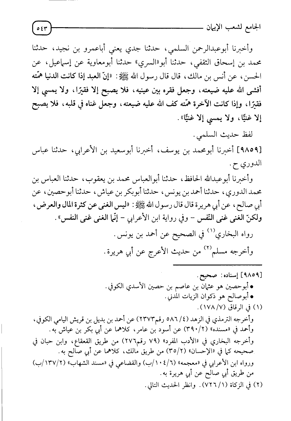 9859 - أَخْبَرَنَا أَبُو مُحَمَّدِ بْنُ يُوسُفَ , أَنَا أَبُو سَعِيدِ بْنُ الْأَعْرَابِيِّ , نَا عَبَّاسٌ الدُّورِيُّ , ح وَأَخْبَرَنَا أَبُو عَبْدِ اللهِ الْحَافِظُ , نَا أَبُو الْعَبَّاسِ مُحَمَّدُ بْنُ يَعْقُوبَ , نَا الْعَبَّاسُ بْنُ مُحَمَّدٍ الدُّورِيُّ , نَا أَحْمَدُ بْنُ يُونُسَ , نَا أَبُو بَكْرِ بْنُ عَيَّاشٍ , نَا أَبُو حُصَيْنٍ , عَنْ أَبِي صَالِحٍ , عَنْ أَبِي هُرَيْرَةَ قَالَ: قَالَ رَسُولُ اللهِ صَلَّى اللَّهُ عَلَيْهِ وَسَلَّمَ: §" لَيْسَ الْغِنَى عَنْ كَثْرَةِ الْمَالِ وَالْعَرَضِ , وَلَكِنَّ الْغِنَى غِنَى النَّفْسِ " وَفِي رِوَايَةِ ابْنِ الْأَعْرَابِيِّ: " إِنَّمَا الْغِنَى غِنَى النَّفْسِ " رَوَاهُ الْبُخَارِيُّ فِي الصَّحِيحِ , عَنْ أَحْمَدَ بْنِ يُونُسَ , وَأَخْرَجَهُ مُسْلِمٌ مِنْ حَدِيثِ الْأَعْرَجِ , عَنْ أَبِي هُرَيْرَةَ