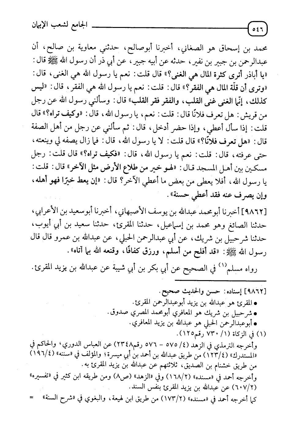 9862 - أَخْبَرَنَا أَبُو مُحَمَّدٍ عَبْدُ اللهِ بْنُ يُوسُفَ الْأَصْبَهَانِيُّ , أَنَا أَبُو سَعِيدِ بْنُ الْأَعْرَابِيُّ , نَا الصَّائِغُ وَهُوَ مُحَمَّدُ بْنُ إِسْمَاعِيلَ , نَا الْمُقْرِئُ , نَا سَعِيدُ بْنُ أَبِي أَيُّوبَ , نَا شُرَحْبِيلُ بْنُ شَرِيكٍ , عَنْ أَبِي عَبْدِ الرَّحْمَنِ الْحُبُلِيُّ , عَنْ عَبْدِ اللهِ بْنِ عَمْرٍو قَالَ: قَالَ رَسُولُ اللهِ صَلَّى اللَّهُ عَلَيْهِ وَسَلَّمَ: §" قَدْ أَفْلَحَ مَنْ أَسْلَمَ , وَرُزِقَ كَفَافًا , وَقَنَّعَهُ اللهُ بِمَا أَتَاهُ " رَوَاهُ مُسْلِمٌ فِي الصَّحِيحِ , عَنْ أَبِي بَكْرِ بْنِ أَبِي شَيْبَةَ , عَنْ عَبْدِ اللهِ بْنِ يَزِيدَ الْمُقْرِئِ