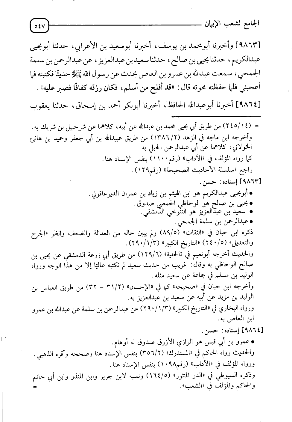 9863 - وَأَخْبَرَنَا أَبُو مُحَمَّدِ بْنُ يُوسُفَ , أَنَا أَبُو سَعِيدِ بْنُ الْأَعْرَابِيِّ , نَا أَبُو يَحْيَى عَبْدُ الْكَرِيمِ , نَا يَحْيَى بْنُ صَالِحٍ , نَا سَعِيدُ بْنُ عَبْدِ الْعَزِيزِ عَنْ عَبْدِ الرَّحْمَنِ بْنِ سَلَمَةَ الْجُمَحِيِّ , سَمِعْتُ عَبْدَ اللهِ بْنَ عَمْرِو بْنِ الْعَاصِ يُحَدِّثُ , عَنْ رَسُولِ اللهِ صَلَّى اللَّهُ عَلَيْهِ وَسَلَّمَ حَدِيثًا فَكَتَبْتُهُ فَأَعْجَبَنِي , فَلَمَّا حَفِظْتُهُ مَحَوْتُهُ , قَالَ: §" قَدْ أَفْلَحَ مَنْ أَسْلَمَ وَكَانَ رِزْقُهُ كَفَافًا فَصَبَرَ عَلَيْهِ "