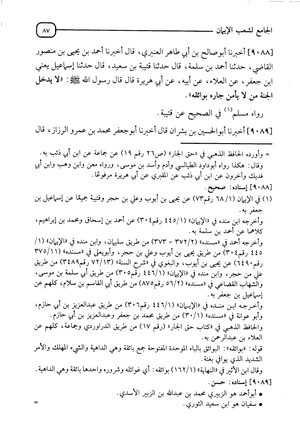 9088 - أَخْبَرَنَا أَبُو صَالِحِ بْنُ أَبِي طَاهِرٍ الْعَنْبَرِيُّ، قَالَ: أَنَا أَحْمَدُ بْنُ يَحْيَى بْنِ مَنْصُورٍ الْقَاضِي، قَالَ: نَا أَحْمَدُ بْنُ سَلَمَةَ، قَالَ: نَا قُتَيْبَةُ بْنُ سَعِيدٍ، قَالَ: نَا إِسْمَاعِيلُ يَعْنِي ابْنَ جَعْفَرٍ، عَنِ الْعَلَاءِ، عَنْ أَبِيهِ، عَنْ أَبِي هُرَيْرَةَ، قَالَ: قَالَ رَسُولُ اللهِ صَلَّى اللَّهُ عَلَيْهِ وَسَلَّمَ: " §لَا يَدْخُلُ الْجَنَّةَ مَنْ لَا يَأْمَنُ جَارَهُ بَوَائِقَهُ "، رَوَاهُ مُسْلِمٌ فِي الصَّحِيحِ، عَنْ قُتَيْبَةَ