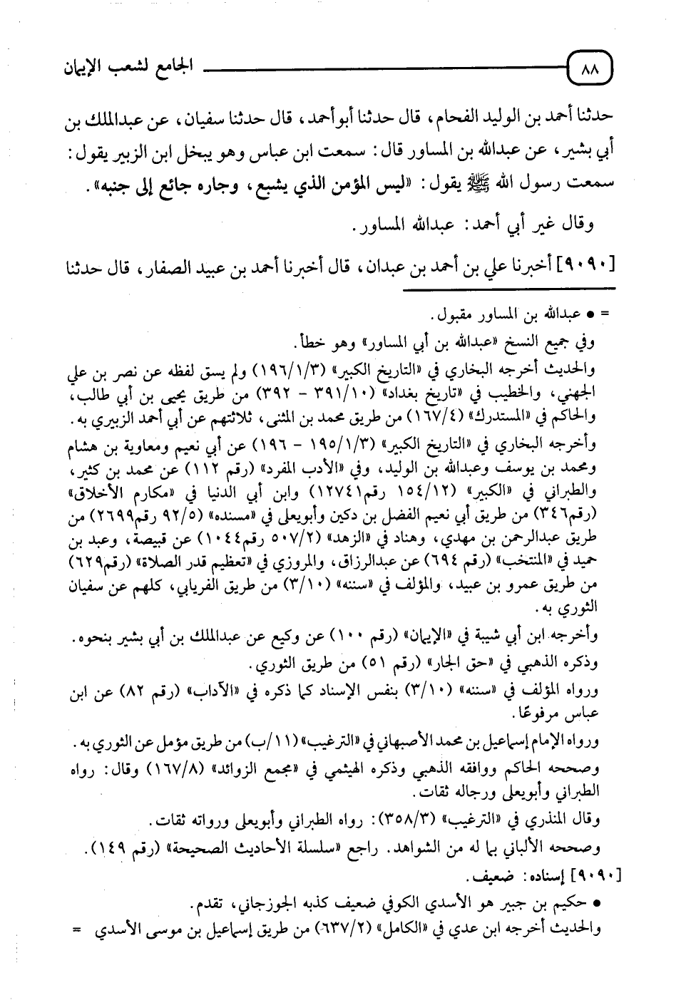 9090 - أَخْبَرَنَا عَلِيُّ بْنُ أَحْمَدَ بْنِ عَبْدَانَ، قَالَ: أَنَا أَحْمَدُ بْنُ عُبَيْدٍ الصَّفَّارُ، قَالَ: نَا -[89]- الْإِسْفَاطِيُّ وَهُوَ الْعَبَّاسُ بْنُ الْفَضْلِ، قَالَ: نَا مِنْجَابُ بْنُ الْحَارِثِ، قَالَ: ابْنُ مُسْهِرٍ، عَنِ الْأَعْمَشِ، عَنْ حَكِيمِ بْنِ جُبَيْرٍ، عَنْ سَعِيدِ بْنِ جُبَيْرٍ، عَنِ ابْنِ عَبَّاسٍ، أَنَّهُ دَخَلَ عَلَى ابْنِ الزُّبَيْرِ وَأَنَا مَعَهُ، فَقَالَ ابْنُ الزُّبَيْرِ: أَنْتَ الَّذِي تَنْحَلُنِي وَتُدْنِينِي، فَقَالَ ابْنُ عَبَّاسٍ: نَعَمْ، إِنَّ رَسُولَ اللهِ صَلَّى اللَّهُ عَلَيْهِ وَسَلَّمَ قَالَ: " §لَيْسَ الْمُسْلِمُ الَّذِي يَشْبَعُ وَيَجُوعُ جَارُهُ "، وَذَكَّرَهُ بَاقِي الْحَدِيثِ