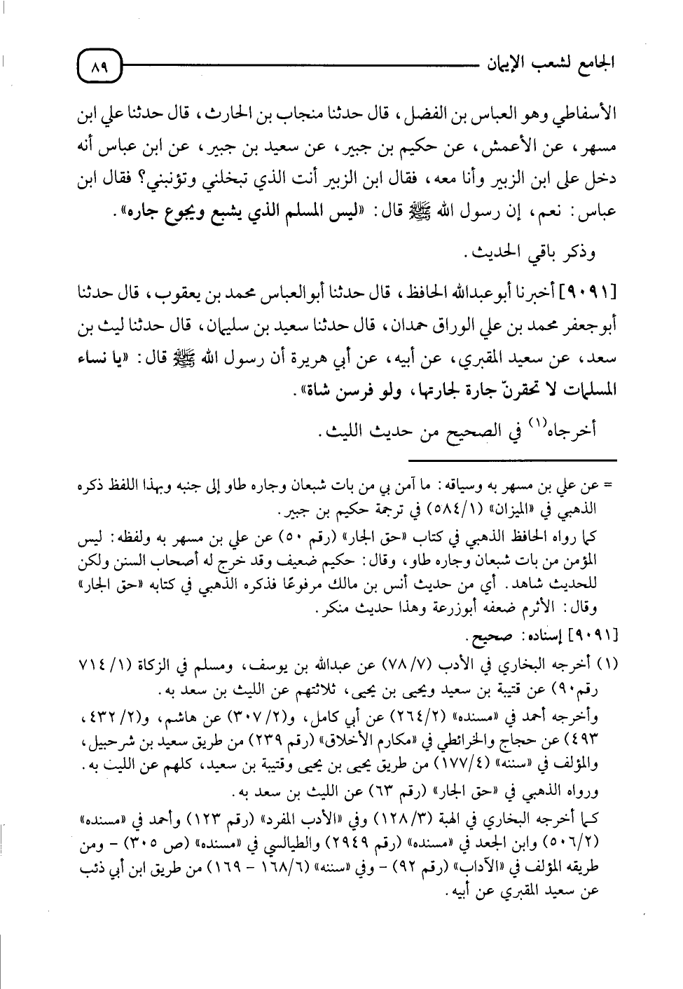 9091 - أَخْبَرَنَا أَبُو عَبْدِ اللهِ الْحَافِظُ، نَا أَبُو الْعَبَّاسِ مُحَمَّدُ بْنُ يَعْقُوبَ، قَالَ: نَا أَبُو جَعْفَرٍ مُحَمَّدُ بْنُ عَلِيٍّ الْوَرَّاقُ حَمْدَانُ، قَالَ: نَا سَعِيدُ بْنُ سُلَيْمَانَ، قَالَ: نَا لَيْثُ بْنُ سَعْدٍ، عَنْ سَعِيدٍ الْمَقْبُرِيِّ، عَنْ أَبِيهِ، عَنْ أَبِي هُرَيْرَةَ، أَنَّ رَسُولَ اللهِ صَلَّى اللَّهُ عَلَيْهِ وَسَلَّمَ قَالَ: " يَا نِسَاءَ الْمُسْلِمَاتِ، §لَا تَحْقِرَنَّ جَارَةٌ لِجَارَتِهَا وَلَوْ فِرْسِنَ شَاةٍ "، أَخْرَجَاهُ فِي الصَّحِيحِ، مِنْ حَدِيثِ اللَّيْثِ