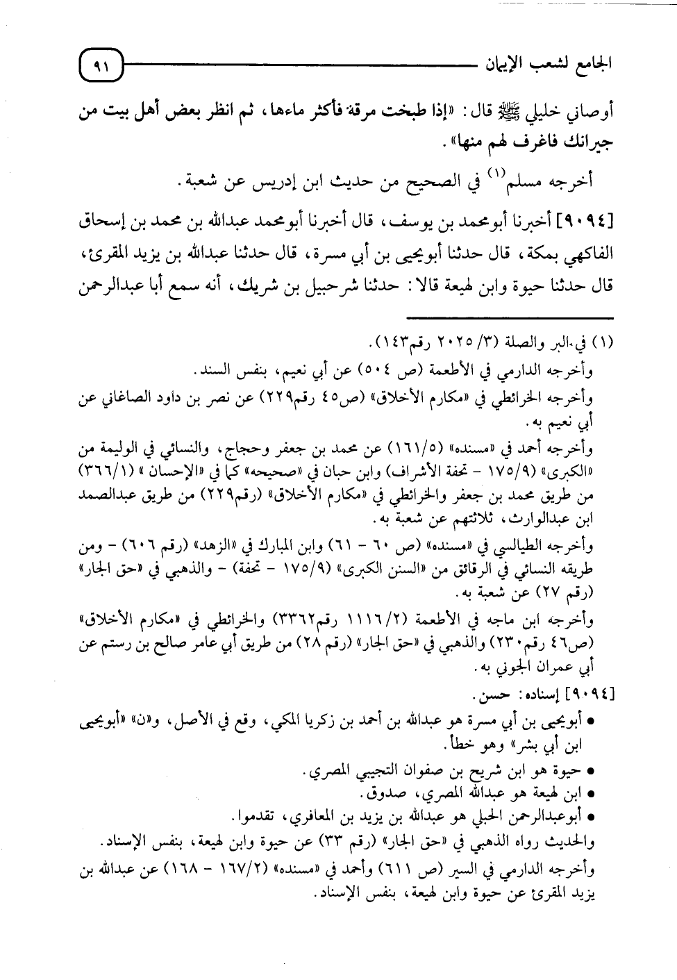 9094 - أَخْبَرَنَا أَبُو مُحَمَّدِ بْنُ يُوسُفَ، قَالَ: أَنَا أَبُو مُحَمَّدٍ عَبْدُ اللهِ بْنُ إِسْحَاقَ الْفَاكِهِيُّ بِمَكَّةَ، قَالَ: نَا أَبُو يَحْيَى بْنُ أَبِي مَسَرَّةَ، قَالَ: نَا عَبْدُ اللهِ بْنُ يَزِيدَ الْمُقْرِئُ، قَالَ: نَا حَيْوَةُ، وَابْنُ لَهِيعَةَ، قَالَا: نَا شُرَحْبِيلُ بْنُ شَرِيكٍ، أَنَّهُ سَمِعَ أَبَا عَبْدِ الرَّحْمَنِ -[92]- الْحُبُلِيَّ يُحَدِّثُ، عَنْ عَبْدِ اللهِ بْنِ عَمْرٍو، عَنْ رَسُولِ اللهِ صَلَّى اللَّهُ عَلَيْهِ وَسَلَّمَ، أَنَّهُ قَالَ: " §خَيْرُ الْأَصْحَابِ عِنْدَ اللهِ خَيْرُهُمْ لِصَاحِبِهِ، وَخَيْرُ الْجِيرَانِ عِنْدَ اللهِ خَيْرُهُمْ لِجَارِهِ "