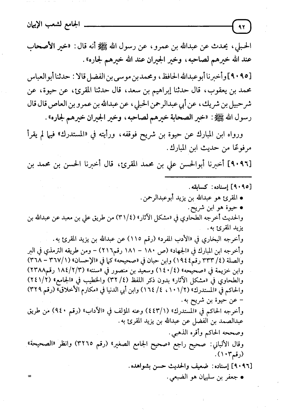 9095 - وَأَخْبَرَنَا أَبُو عَبْدِ اللهِ الْحَافِظُ، وَمُحَمَّدُ بْنُ مُوسَى بْنِ الْفَضْلِ، قَالَا: نَا أَبُو الْعَبَّاسِ مُحَمَّدُ بْنُ يَعْقُوبَ، قَالَ: نَا إِبْرَاهِيمُ بْنُ سَعْدٍ، قَالَ: نَا الْمُقْرِئُ، عَنْ حَيْوَةَ، عَنْ شُرَحْبِيلَ بْنِ شَرِيكٍ، عَنْ أَبِي عَبْدِ الرَّحْمَنِ الْحُبُلِيِّ، عَنْ عَبْدِ اللهِ بْنِ عَمْرِو بْنِ الْعَاصِ، قَالَ: قَالَ رَسُولُ اللهِ صَلَّى اللَّهُ عَلَيْهِ وَسَلَّمَ: " §خَيْرُ الصَّحَابَةِ خَيْرُهُمْ لِصَاحِبِهِ، وَخَيْرُ الْجِيرَانِ خَيْرُهُمْ لِجَارِهِ "، وَرَوَاهُ ابْنُ الْمُبَارَكِ، عَنْ حَيْوَةَ بْنِ شُرَيْحٍ فَوَقَفَهُ، وَرَأَيْتُهُ فِي الْمُسْتَدْرَكِ فِيمَا لَمْ يُقْرَأْ مَرْفُوعًا مِنْ حَدِيثِ ابْنِ الْمُبَارَكِ