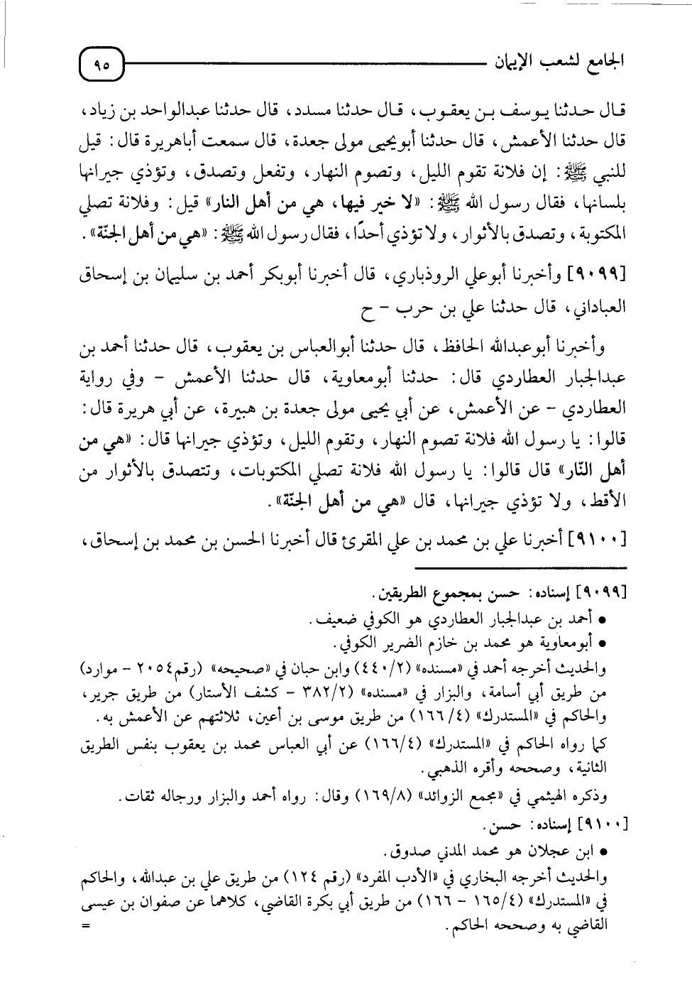 9099 - وَأَخْبَرَنَا أَبُو عَلِيٍّ الرُّوذْبَارِيُّ، قَالَ: أَنَا أَبُو بَكْرٍ أَحْمَدُ بْنُ سُلَيْمَانَ بْنِ إِسْحَاقَ الْعَبَّادَانِيُّ، قَالَ: نَا عَلِيُّ بْنُ حَرْبٍ، ح وَأَخْبَرَنَا أَبُو عَبْدِ اللهِ الْحَافِظُ، قَالَ: نَا أَبُو الْعَبَّاسِ بْنُ يَعْقُوبَ، قَالَ: نَا أَحْمَدُ بْنُ عَبْدِ الْجَبَّارِ الْعُطَارِدِيُّ، قَالَا: نَا أَبُو مُعَاوِيَةَ، قَالَ: نَا الْأَعْمَشُ، وَفِي رِوَايَةِ الْعُطَارِدِيُّ، عَنِ الْأَعْمَشِ، عَنْ أَبِي يَحْيَى مَوْلَى جَعْدَةَ بْنِ هُبَيْرَةَ، عَنْ أَبِي هُرَيْرَةَ، قَالَ: قَالُوا: يَا رَسُولَ اللهِ، §فُلَانَةُ تَصُومُ النَّهَارَ، وَتَقُومُ اللَّيْلَ، وَتُؤْذِي جِيرَانَهَا، قَالَ: " هِيَ مِنْ أَهْلِ النَّارِ "، قَالَ: قَالُوا: يَا رَسُولَ اللهِ، فُلَانَةُ تُصَلِّي الْمَكْتُوبَاتِ، وَتَتَصَدَّقُ بِالْأَثْوَارِ مِنَ الْأَقِطِ وَلَا تُؤْذِي جِيرَانَهَا، قَالَ: " هِيَ مِنْ أَهْلِ الْجَنَّةِ "