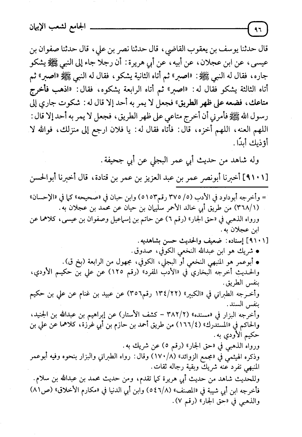 9101 - أَخْبَرَنَا أَبُو نَصْرٍ عُمَرُ بْنُ عَبْدِ الْعَزِيزِ بْنِ عُمَرَ بْنِ قَتَادَةَ، قَالَ: أَنَا أَبُو الْحَسَنِ -[97]- مُحَمَّدُ بْنُ الْحَسَنِ بْنِ إِسْمَاعِيلَ السِّرَاجُ، قَالَ: نَا عَبْدُ اللهِ بْنُ عَثَّامِ بْنِ حَفْصِ بْنِ غِيَاثٍ، نَا عَلِيُّ بْنُ حَكَمٍ الْأَوْدِيُّ، قَالَ: أَنَا شَرِيكٌ، عَنْ أَبِي عُمَرَ، عَنْ أَبِي جُحَيْفَةَ، قَالَ: جَاءَ رَجُلٌ إِلَى النَّبِيِّ صَلَّى اللَّهُ عَلَيْهِ وَسَلَّمَ §يَشْكُو جَارَهُ، فَقَالَ لَهُ النَّبِيُّ صَلَّى اللَّهُ عَلَيْهِ وَسَلَّمَ: " اطْرَحْ مَتَاعَكَ عَلَى الطَّرِيقِ أَوْ فِي الطَّرِيقِ " فَطَرَحَهُ، فَجَعَلَ النَّاسُ يَمُرُّونَ عَلَيْهِ يَلْعَنُونَهُ، فَجَاءَ إِلَى النَّبِيِّ صَلَّى اللَّهُ عَلَيْهِ وَسَلَّمَ، فَقَالَ: يَا رَسُولَ اللهِ، مَا لَقِيتُ مِنَ النَّاسِ؟ قَالَ: " وَمَا لَقِيتَ مِنْهُمْ؟ " قَالَ: يَلْعَنُونِي، قَالَ: " فَقَدْ لَعَنَكَ اللهُ عَزَّ وَجَلَّ قَبْلَ النَّاسِ "، قَالَ: فَإِنِّي لَا أَعُودُ أَبَدًا يَا رَسُولَ اللهِ، قَالَ: فَجَاءَ الَّذِي شَكَى إِلَى النَّبِيِّ صَلَّى اللَّهُ عَلَيْهِ وَسَلَّمَ، فَقَالَ لَهُ النَّبِيُّ صَلَّى اللَّهُ عَلَيْهِ وَسَلَّمَ: " ارْفَعْ مَتَاعَكَ، فَقَدْ أَمِنْتُ أَوْ كُفِيتَ "، وَقَالَ غَيْرُهُ: عَنْ عَلِيِّ بْنِ حَكِيمٍ: " إِنَّ لَعْنَةَ اللهِ فَوْقَ لَعْنَتِهِمْ "