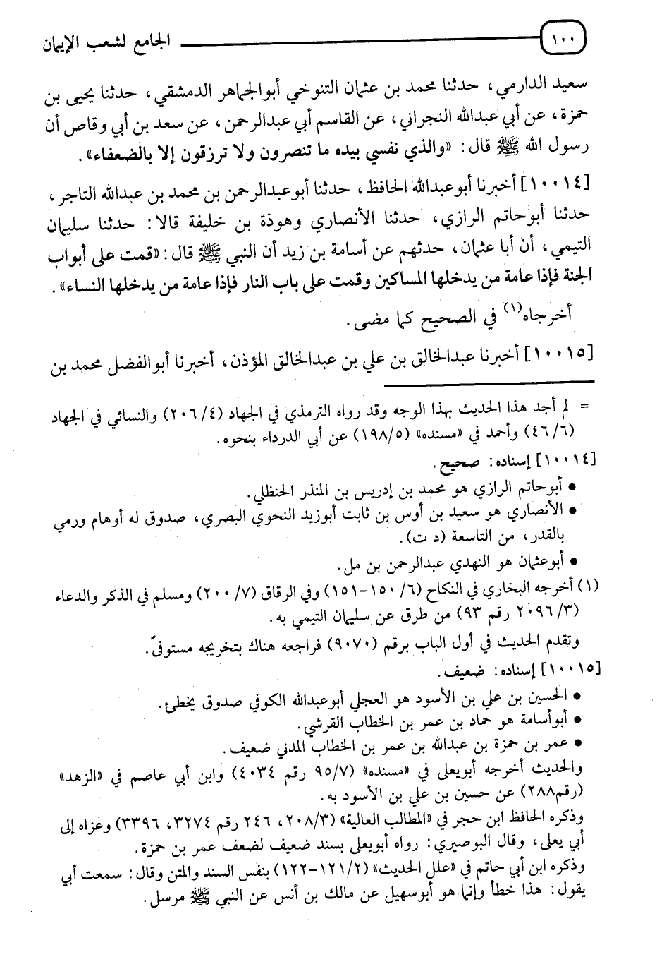 10014 - أَخْبَرَنَا أَبُو عَبْدِ اللهِ الْحَافِظُ، ثَنَا أَبُو عَبْدِ الرَّحْمَنِ مُحَمَّدُ بْنُ عَبْدِ اللهِ التَّاجِرُ، ثَنَا أَبُو حَاتِمٍ الرَّازِيُّ، ثَنَا الْأَنْصَارِيُّ، وَهَوْذَةُ بْنُ خَلِيفَةَ، قَالَا: ثَنَا سُلَيْمَانُ التَّيْمِيُّ، أَنَّ أَبَا عُثْمَانَ، حَدَّثَهُمْ، عَنْ أُسَامَةَ بْنِ زَيْدٍ، أَنَّ النَّبِيَّ صَلَّى اللَّهُ عَلَيْهِ وَسَلَّمَ قَالَ: " §قُمْتُ عَلَى أَبْوَابِ الْجَنَّةِ فَإِذَا عَامَّةُ مَنْ يَدْخُلُهَا الْمَسَاكِينُ، وَقُمْتُ عَلَى بَابِ النَّارِ فَإِذَا عَامَّةُ مَنْ يَدْخُلُهَا النِّسَاءُ ". أَخْرَجَاهُ فِي الصَّحِيحِ كَمَا مَعْنَى