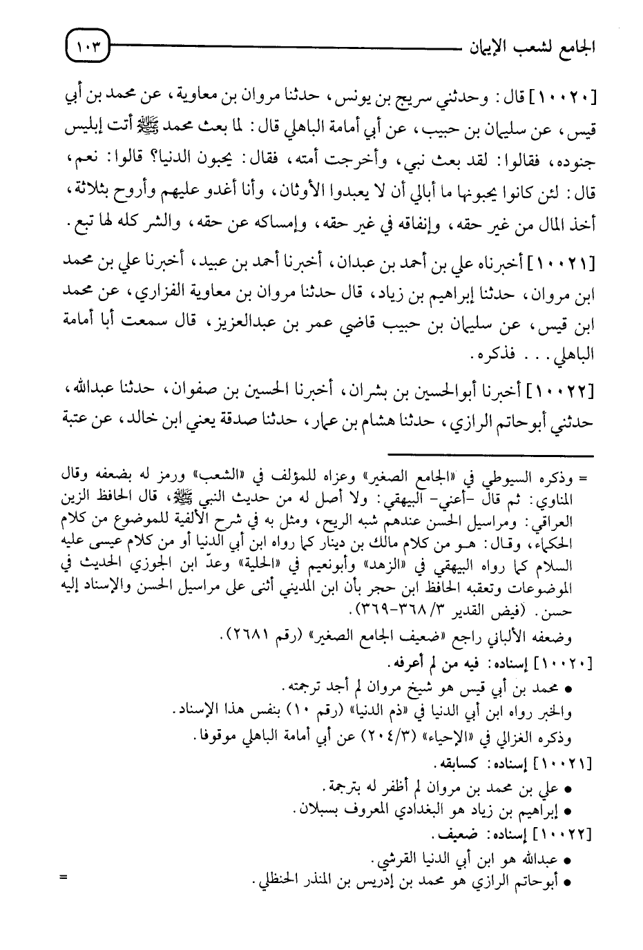 10020 - قَالَ وَحَدَّثَنِي سُرَيْجُ بْنُ يُونُسَ، ثَنَا مَرْوَانُ بْنُ مُعَاوِيَةَ، عَنْ مُحَمَّدِ بْنِ أَبِي قَيْسٍ، عَنْ سُلَيْمَانَ بْنِ حَبِيبٍ، عَنْ أَبِي أُمَامَةَ الْبَاهِلِيِّ، قَالَ: لَمَّا بُعِثَ مُحَمَّدٌ صَلَّى اللَّهُ عَلَيْهِ وَسَلَّمَ أَتَتْ إِبْلِيسَ جُنُودُهُ، فَقَالُوا: قَدْ بُعِثَ نَبِيٌّ، وَأُخْرِجَتْ أُمَّتُهُ، فَقَالَ: " يُحِبُّونَ الدُّنْيَا؟ " قَالُوا: نَعَمْ، قَالَ: §" لَئِنْ كَانُوا جَمِيعًا يُحِبُّونَهَا مَا أُبَالِي أَنْ لَا يَعْبُدُوا الْأَوْثَانَ، وَأَنَا أَغْدُو عَلَيْهِمْ وَأَرُوحُ بِثَلَاثَةٍ: أَخْذُ الْمَالِ مِنْ غَيْرِ حَقِّهِ، وَإِنْفَاقُهُ فِي غَيْرِ حَقِّهِ، وَإِمْسَاكُهُ عَنْ حَقِّهِ، وَالشَّرُّ كُلُّهُ لَهَا تَبَعٌ ".