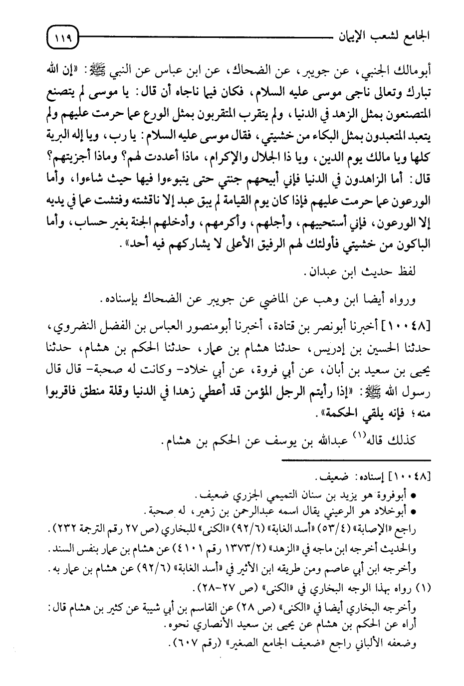 10048 - أَخْبَرَنَا أَبُو نَصْرِ بْنُ قَتَادَةَ، أَنَا أَبُو مَنْصُورٍ الْعَبَّاسُ بْنُ الْفَضْلِ النَّضْرَوِيُّ، ثَنَا الْحُسَيْنُ بْنُ إِدْرِيسَ، ثَنَا هِشَامُ بْنُ عَمَّارٍ، ثَنَا الْحَكَمُ بْنُ هِشَامٍ، ثَنَا يَحْيَى بْنُ سَعِيدِ بْنِ أَبَانَ، عَنْ أَبِي فَرْوَةَ، عَنْ أَبِي خَلَّادٍ، وَكَانَتْ لَهُ صُحْبَةٌ، قَالَ: قَالَ رَسُولُ اللهِ صَلَّى اللَّهُ عَلَيْهِ وَسَلَّمَ: §" إِذَا رَأَيْتُمُ الرَّجُلَ الْمُؤْمِنَ قَدْ أُعْطِيَ زُهْدًا فِي الدُّنْيَا وَقِلَّةَ مَنْطِقٍ فَاقْتَرِبُوا مِنْهُ فَإِنَّهُ يُلْقِي الْحِكْمَةَ ". وَكَذَلِكَ قَالَ عَبْدُ اللهِ بْنُ يُوسُفَ: عَنِ الْحَكَمِ بْنِ هِشَامٍ. -[120]- وَقَالَ أَحْمَدُ بْنُ إِبْرَاهِيمَ: عَنْ يَحْيَى، سَمِعَ أَبَا فَرْوَةَ الْجَزَرِيَّ، عَنْ أَبِي مَرْيَمَ، عَنْ أَبِي خَلَّادٍ، عَنِ النَّبِيِّ صَلَّى اللَّهُ عَلَيْهِ وَسَلَّمَ. قَالَ الْبُخَارِيُّ: " وَهَذَا أَصَحُّ "