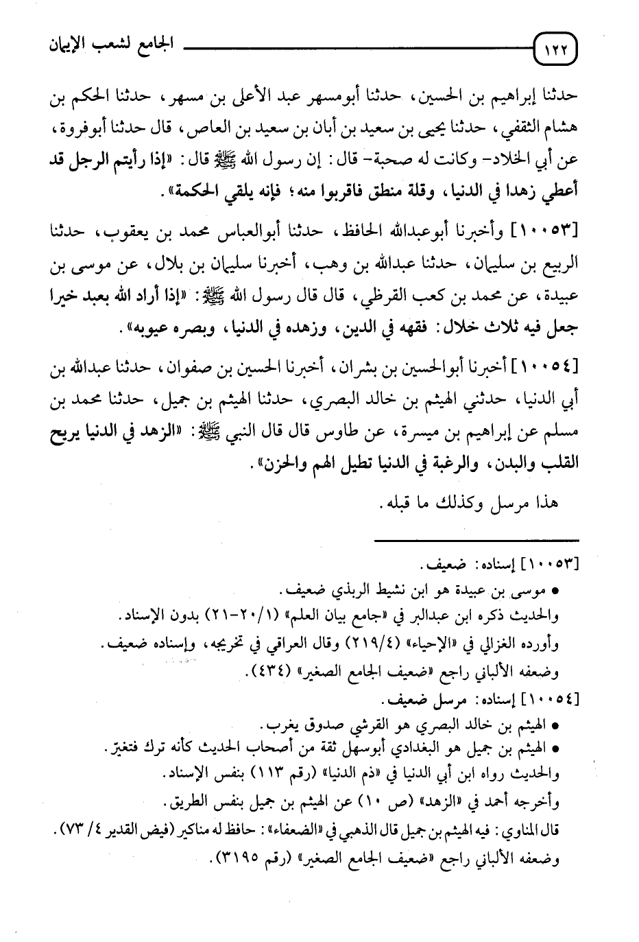 10054 - أَخْبَرَنَا أَبُو الْحُسَيْنِ بْنُ بُشْرَانَ، ثَنَا الْحُسَيْنُ بْنُ صَفْوَانَ، ثَنَا عَبْدُ اللهِ بْنُ أَبِي الدُّنْيَا، حَدَّثَنِي الْهَيْثَمُ بْنُ خَالِدٍ الْبَصْرِيُّ، ثَنَا الْهَيْثَمُ بْنُ جَمِيلٍ، ثَنَا مُحَمَّدُ بْنُ مُسْلِمٍ، عَنْ إِبْرَاهِيمَ بْنِ مَيْسَرَةَ، عَنْ طَاوُسٍ، قَالَ: قَالَ النَّبِيُّ صَلَّى اللَّهُ عَلَيْهِ وَسَلَّمَ: " §الزُّهْدُ فِي الدُّنْيَا يُرِيحُ الْقَلْبَ وَالْبَدَنَ، وَالرَّغْبَةُ فِي الدُّنْيَا يُطِيلُ الْهَمَّ وَالْحُزْنَ " " هَذَا مُرْسَلٌ، وَكَذَلِكَ مَا قَبْلَهُ ". -[123]- وَرَوَاهُ أَيْضًا فُضَيْلُ بْنُ عِيَاضٍ، عَنِ النَّبِيِّ صَلَّى اللَّهُ عَلَيْهِ وَسَلَّمَ مُنْقَطِعًا وَقَدْ رُوِيَ مَوْصُولًا مِنْ وَجْهٍ آخَرَ