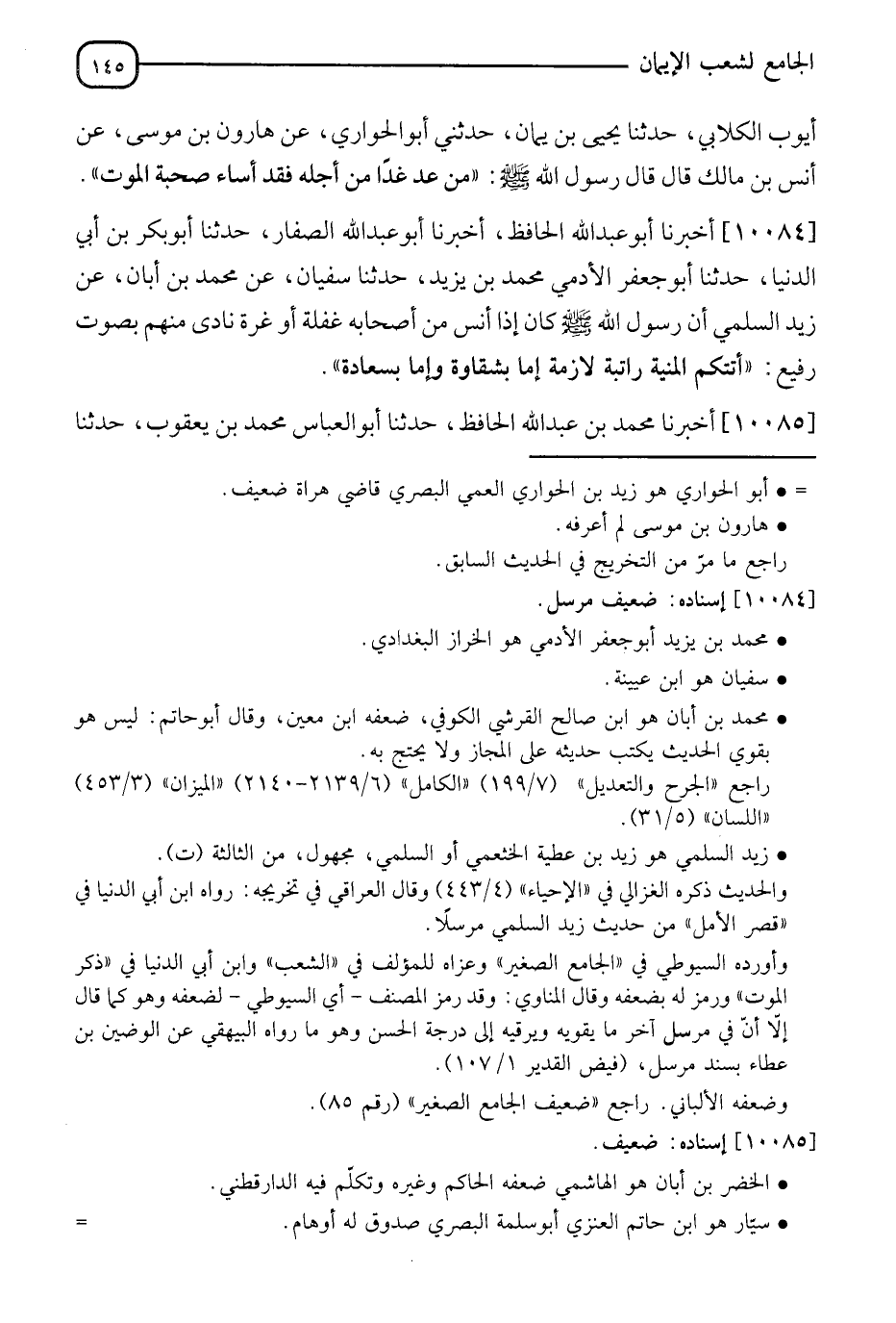 10084 - أَخْبَرَنَا أَبُو عَبْدِ اللهِ الْحَافِظُ، أَنَا أَبُو عَبْدِ اللهِ الصَّفَّارُ، أَنَا أَبُو بَكْرِ بْنُ أَبِي الدُّنْيَا، أَنَا أَبُو جَعْفَرٍ الْآدَمِيُّ مُحَمَّدُ بْنُ يَزِيدَ، ثَنَا سُفْيَانُ، عَنْ مُحَمَّدِ بْنِ أَبَانَ، عَنْ زَيْدٍ السَّلِيمِيُّ، أَنَّ النَّبِيَّ صَلَّى اللَّهُ عَلَيْهِ وَسَلَّمَ كَانَ إِذَا آنَسَ مِنْ أَصْحَابِهِ غَفْلَةً - أَوْ غِرَّةً - نَادَى فِيهِمْ بِصَوْتٍ رَفِيعٍ: " §أَتَتْكُمُ الْمَنِيَّةُ رَاتِبَةً لَازِمَةً، إِمَّا بِشَقَاوَةٍ وَإِمَّا بِسَعَادَةٍ "