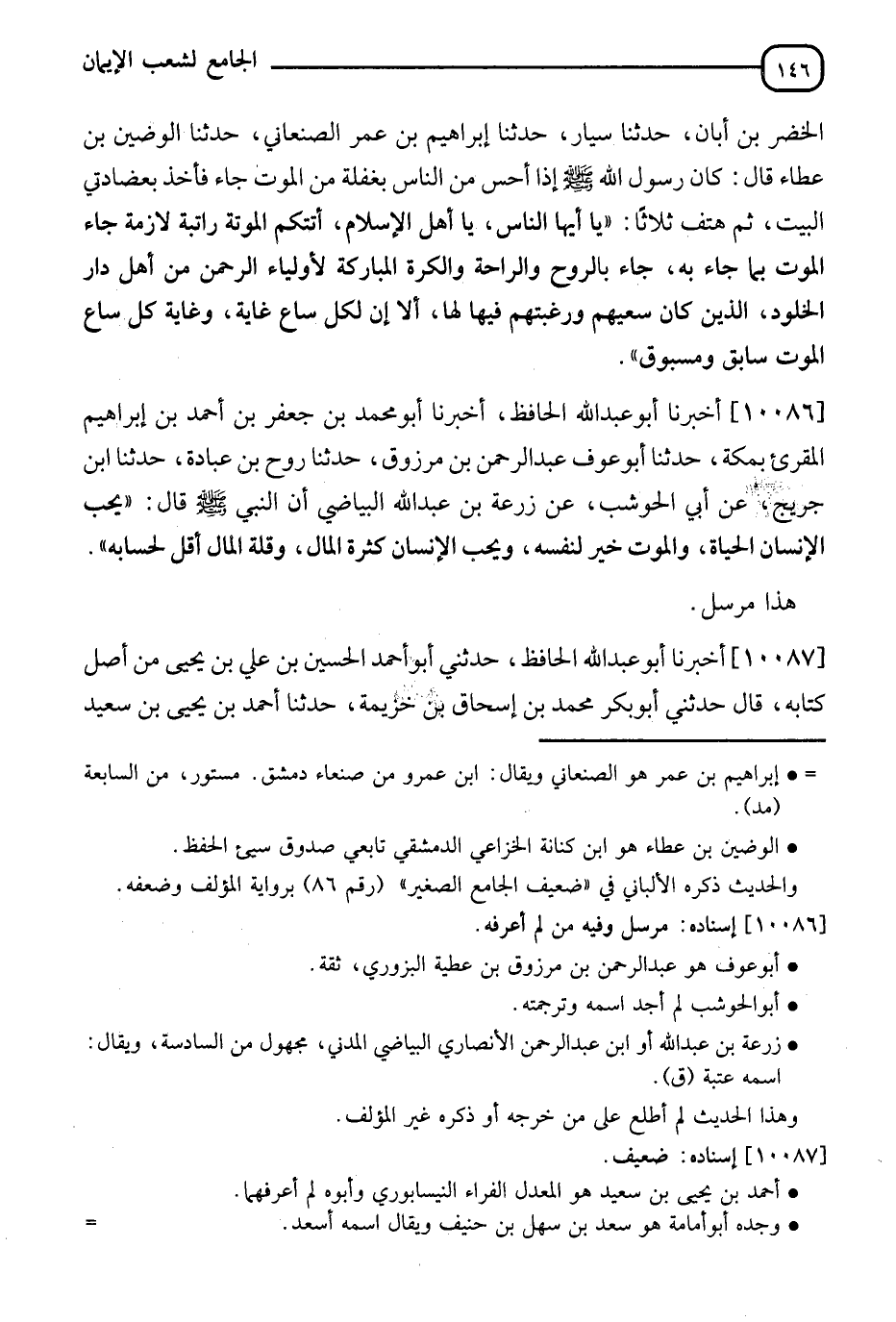 10086 - أَخْبَرَنَا أَبُو عَبْدِ اللهِ الْحَافِظُ، أَنَا أَبُو مُحَمَّدٍ جَعْفَرُ بْنُ أَحْمَدَ بْنِ إِبْرَاهِيمَ الْمُقْرِئُ بِمَكَّةَ، ثَنَا أَبُو عَوْفٍ، عَنْ عَبْدِ الرَّحْمَنِ بْنِ مَرْزُوقٍ، ثَنَا رَوْحُ بْنُ عِبَادَةَ، ثَنَا ابْنُ جُرَيْجٍ، عَنْ أَبِي الْحَوْشَبِ، عَنْ زُرْعَةَ بْنِ عَبْدِ اللهِ الْبَيَاضِ، أَنَّ النَّبِيَّ صَلَّى اللَّهُ عَلَيْهِ وَسَلَّمَ قَالَ: " §يُحِبُّ الْإِنْسَانُ الْحَيَاةَ وَالْمَوْتَ خَيْرٌ لِنَفْسِهِ، وَيُحِبُّ الْإِنْسَانُ كَثْرَةَ الْمَالِ، وَقِلَّةُ الْمَالِ أَقَلُّ لِحِسَابِهِ " " هَذَا مُرْسَلٌ "