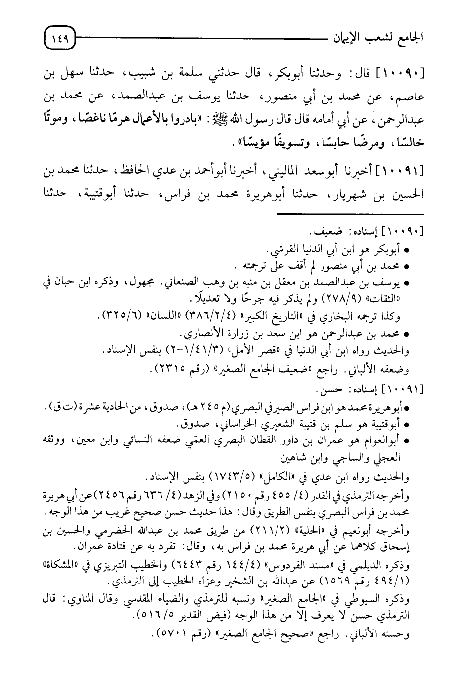 10090 - قَالَ وَثَنَا أَبُو بَكْرٍ، قَالَ: حَدَّثَنِي سَلَمَةُ بْنُ شَبِيبٍ، ثَنَا سَهْلُ بْنُ عَاصِمٍ، عَنْ مُحَمَّدِ بْنِ أَبِي مَنْصُورٍ، ثَنَا يُوسُفُ بْنُ عَبْدِ الصَّمَدِ، عَنْ مُحَمَّدِ بْنِ عَبْدِ الرَّحْمَنِ، عَنْ أَبِي أُمَامَةَ، قَالَ: قَالَ رَسُولُ اللهِ صَلَّى اللَّهُ عَلَيْهِ وَسَلَّمَ: " §بَادِرُوا بِالْأَعْمَالِ هَرَمًا نَاغِصًا، وَمَوْتًا خَالِسًا، وَمَرَضًا حَابِسًا، وَتَسْوِيفًا مُؤْيِسًا "