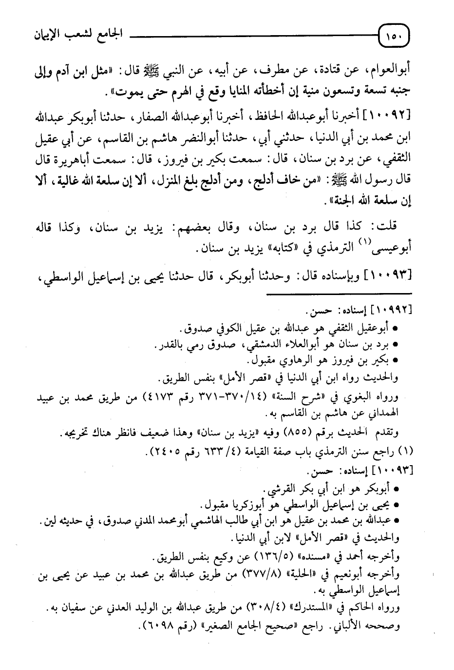 10092 - أَخْبَرَنَا أَبُو عَبْدِ اللهِ الْحَافِظُ، ثَنَا أَبُو عَبْدِ اللهِ الصَّفَّارُ، ثَنَا أَبُو بَكْرٍ عَبْدُ اللهِ بْنُ مُحَمَّدِ بْنِ أَبِي الدُّنْيَا، حَدَّثَنِي أَبِي، ثَنَا أَبُو النَّضْرِ هَاشِمُ بْنُ الْقَاسِمِ، عَنْ أَبِي عُقَيْلٍ الثَّقَفِيِّ، عَنْ بُرْدِ بْنِ سِنَانٍ، قَالَ: سَمِعْتُ بُكَيْرَ بْنَ فَيْرُوزٍ، قَالَ: سَمِعْتُ أَبَا هُرَيْرَةَ، قَالَ: قَالَ رَسُولُ اللهِ صَلَّى اللَّهُ عَلَيْهِ وَسَلَّمَ: " §مَنْ خَافَ أَدْلَجَ، وَمَنْ أَدْلَجَ بَلَغَ الْمَنْزِلَ، أَلَا إِنَّ سِلْعَةَ اللهِ غَالِيَةٌ، أَلَا إِنَّ سِلْعَةَ اللهِ الْجَنَّةُ ". قُلْتُ: كَذَا قَالَ بُرْدُ بْنُ سِنَانٍ، وَقَالَ بَعْضُهُمْ: يَزِيدُ بْنُ سِنَانٍ، وَكَذَا قَالَهُ أَبُو عِيسَى التِّرْمِذِيُّ فِي كِتَابِهِ، يَزِيدُ بْنُ سِنَانٍ