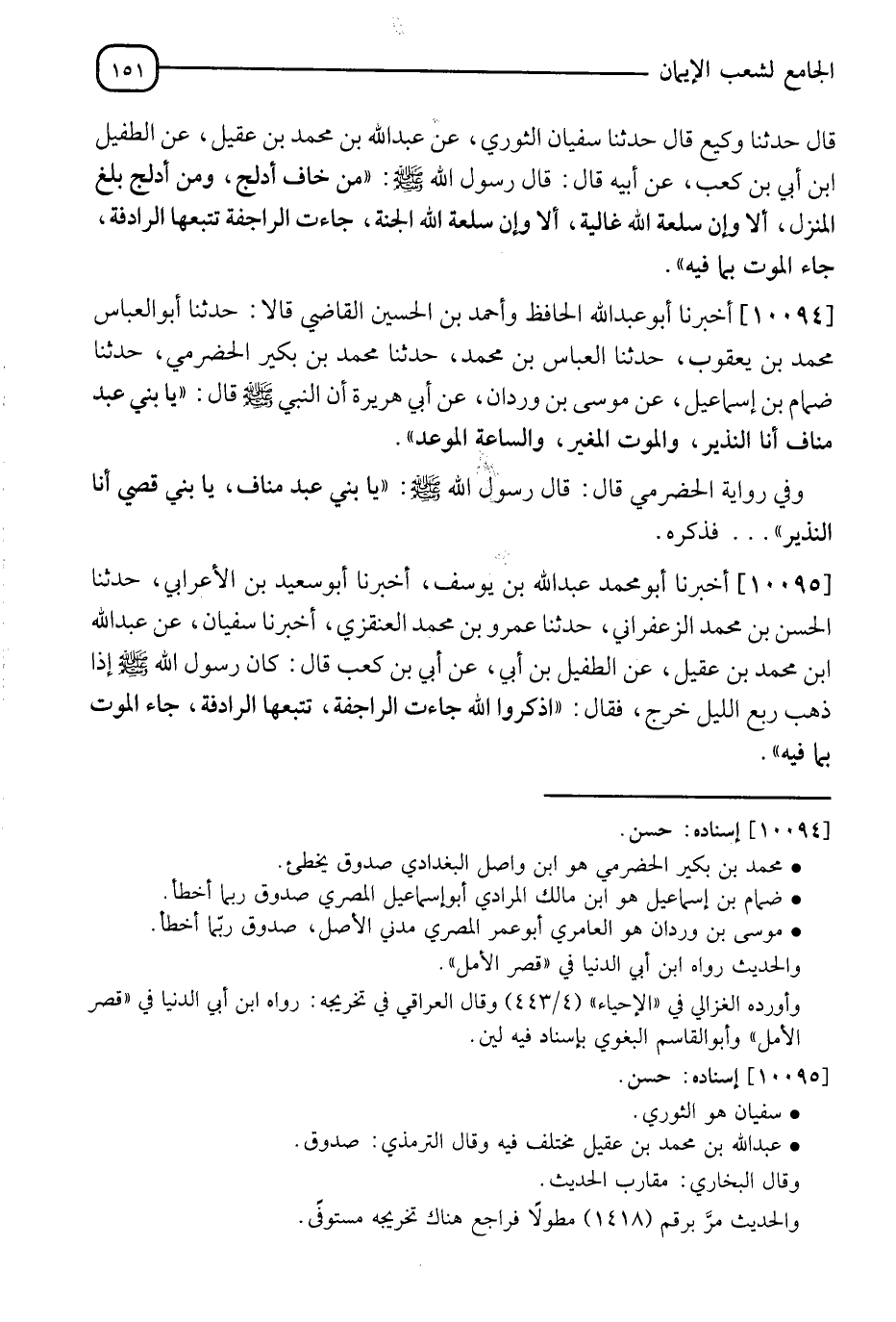 10095 - أَخْبَرَنَا أَبُو مُحَمَّدٍ عَبْدُ اللهِ بْنُ يُوسُفَ، ثَنَا أَبُو سَعِيدِ بْنُ الْأَعْرَابِيِّ، ثَنَا الْحَسَنُ بْنُ مُحَمَّدٍ الزَّعْفَرَانِيُّ، ثَنَا عَمْرُو بْنُ مُحَمَّدٍ الْعَنْقَزِيُّ، أَنَا سُفْيَانُ، عَنْ عَبْدِ اللهِ بْنِ مُحَمَّدِ بْنِ عُقَيْلٍ، عَنِ الطُّفَيْلِ بْنِ أُبَيٍّ، عَنْ أُبَيِّ بْنِ كَعْبٍ، قَالَ: كَانَ رَسُولُ اللهِ صَلَّى اللَّهُ عَلَيْهِ وَسَلَّمَ إِذَا ذَهَبَ رُبْعُ اللَّيْلِ خَرَجَ فَقَالَ: " §اذْكُرُوا اللهَ، اذْكُرُوا اللهَ جَاءَتِ الرَّاجِفَةُ تَتْبَعُهَا الرَّادِفَةُ، جَاءَ الْمَوْتُ بِمَا فِيهِ "