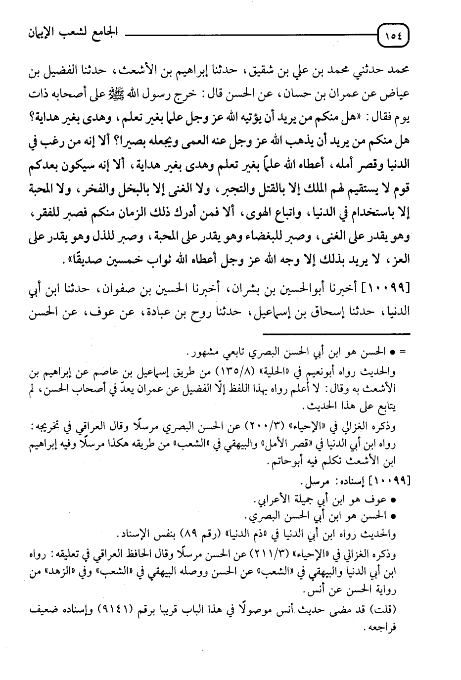 10099 - أَخْبَرَنَا أَبُو الْحُسَيْنِ بْنُ بُشْرَانَ، أَنَا الْحُسَيْنُ بْنُ صَفْوَانَ، ثَنَا ابْنُ أَبِي الدُّنْيَا، ثَنَا إِسْحَاقُ بْنُ إِسْمَاعِيلَ، ثَنَا رَوْحُ بْنُ عُبَادَةَ، عَنْ عَوْفٍ، عَنِ الْحَسَنِ، -[155]- قَالَ: بَلَغَنِي أَنَّ رَسُولَ اللهِ صَلَّى اللَّهُ عَلَيْهِ وَسَلَّمَ قَالَ: " §إِنَّمَا مَثَلُ الدُّنْيَا كَمَثَلِ الْمَاشِي فِي الْمَاءِ، هَلْ يَسْتَطِيعُ الَّذِي يَمْشِي فِي الْمَاءِ أَنْ لَا تَبْتَلَّ قَدَمَاهُ "