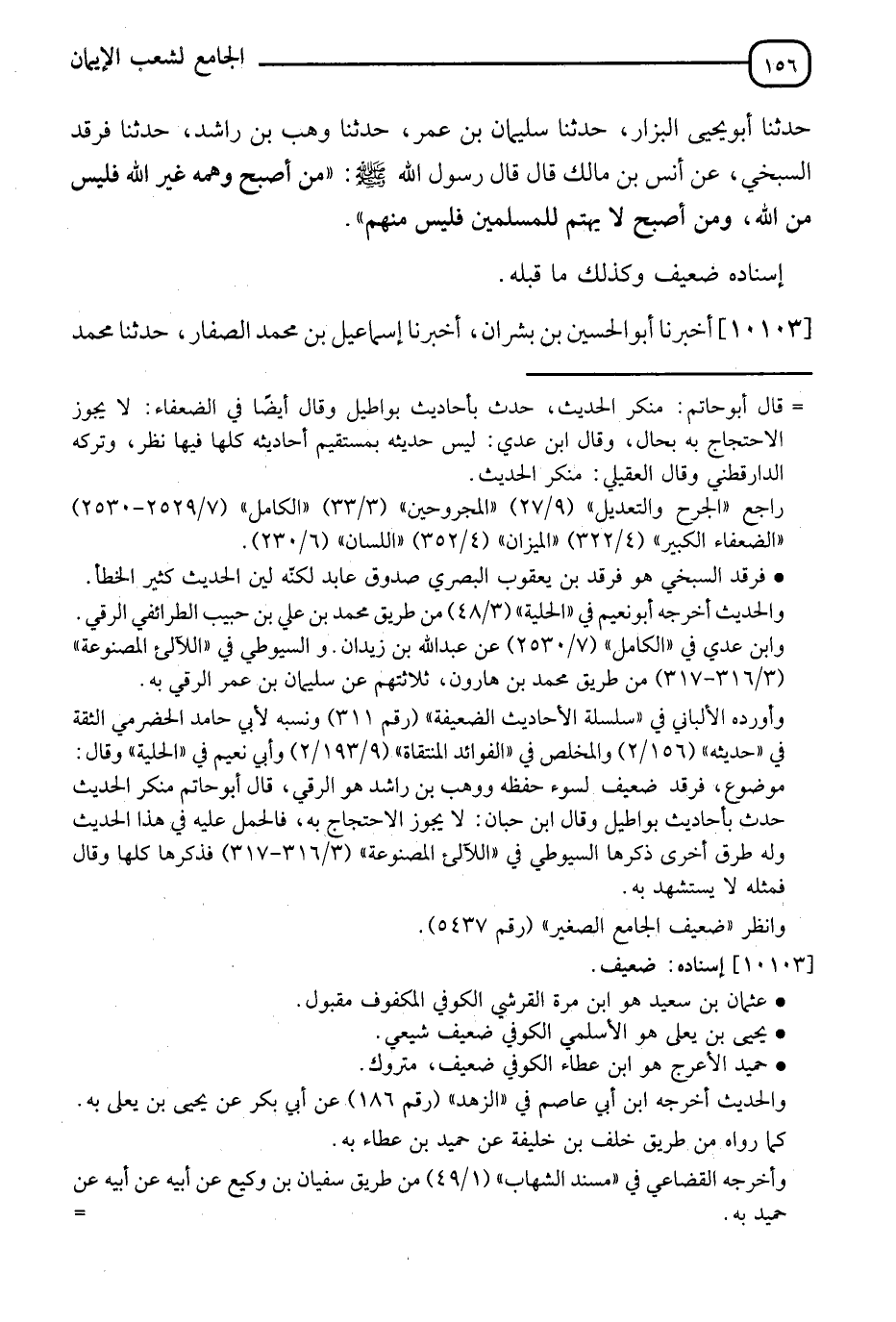 10103 - أَخْبَرَنَا أَبُو الْحُسَيْنِ بْنُ بُشْرَانَ، أَنَا إِسْمَاعِيلُ بْنُ مُحَمَّدٍ الصَّفَّارُ، ثَنَا مُحَمَّدُ -[157]- بْنُ عُبَيْدِ بْنِ عُتْبَةَ الْكِنْدِيُّ، ثَنَا عُثْمَانُ بْنُ سَعِيدٍ، ثَنَا يَحْيَى بْنُ يَعْلَى، عَنْ حُمَيْدٍ الْأَعْرَجِ، عَنْ عَبْدِ اللهِ بْنِ الْحَارِثِ، عَنْ عَبْدِ اللهِ بْنِ مَسْعُودٍ، قَالَ: قَالَ رَسُولُ اللهِ صَلَّى اللَّهُ عَلَيْهِ وَسَلَّمَ: " §عَجِبْتُ لِغَافِلٍ وَلَا يُغْفَلُ عَنْهُ، وَعَجِبْتُ لِمَنْ يُؤَمِّلُ الدُّنْيَا وَالْمَوْتُ يَطْلُبُهُ، وَعَجِبْتُ لِضَاحِكٍ مِلْءَ فِيهِ وَلَا يَدْرِي أَرُضِيَ عَنْهُ أَمْ سُخِطَ "
