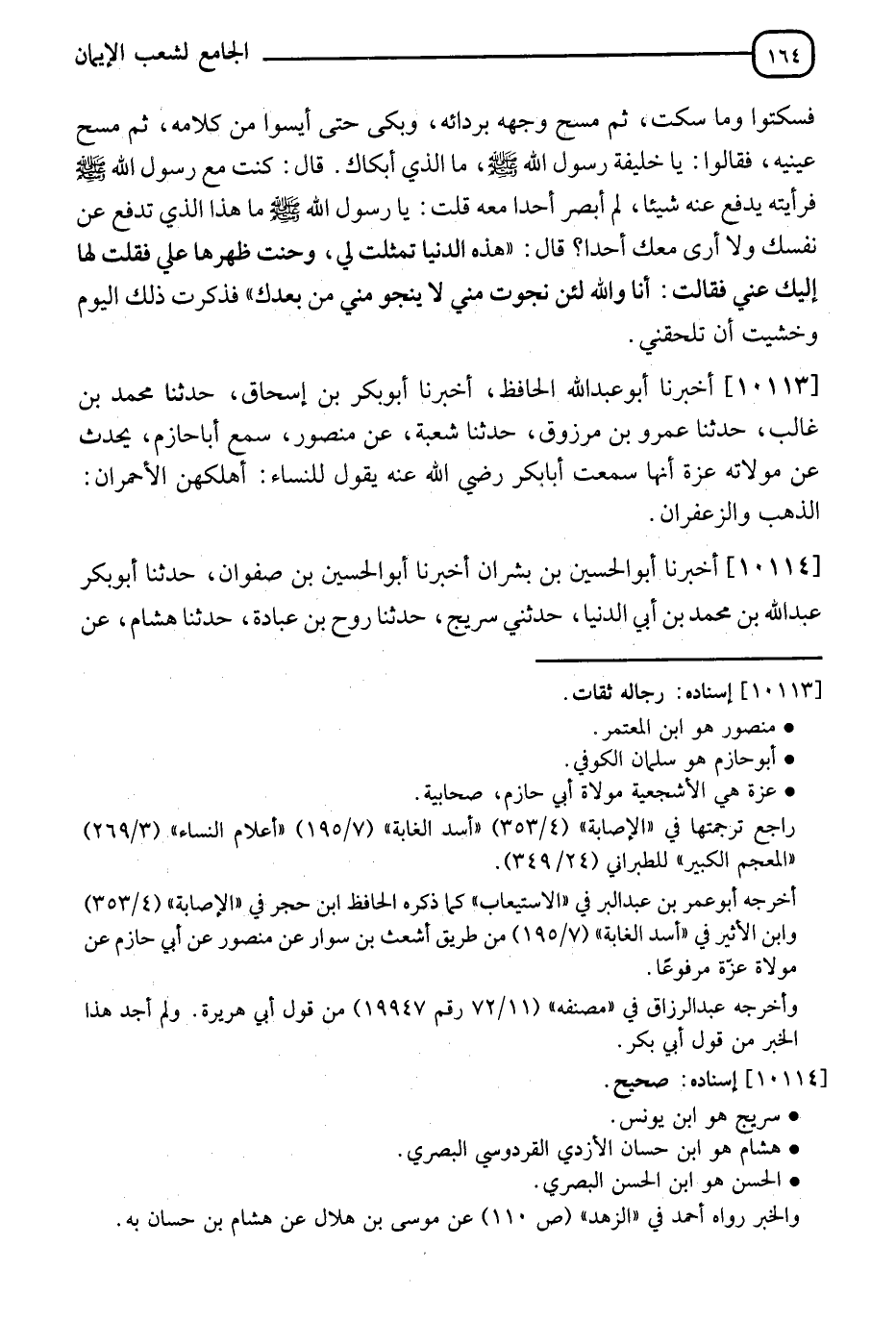 10113 - أَخْبَرَنَا أَبُو عَبْدِ اللهِ الْحَافِظُ، أَنَا أَبُو بَكْرِ بْنُ إِسْحَاقَ، ثَنَا مُحَمَّدُ بْنُ غَالِبٍ، ثَنَا عَمْرُو بْنُ مَرْزُوقٍ، أَنَا شُعْبَةُ، عَنْ مَنْصُورٍ، سَمِعَ أَبَا حَازِمٍ، يُحَدِّثُ عَنْ مَوْلَاتِهِ نَمِرَةَ، أَنَّهَا سَمِعَتْ أَبَا بَكْرٍ رَضِيَ اللهُ عَنْهُ يَقُولُ: " §النِّسَاءُ أَهْلَكَهُنَّ الْأَحْمَرَانِ: الذَّهَبُ، وَالزَّعْفَرَانُ "