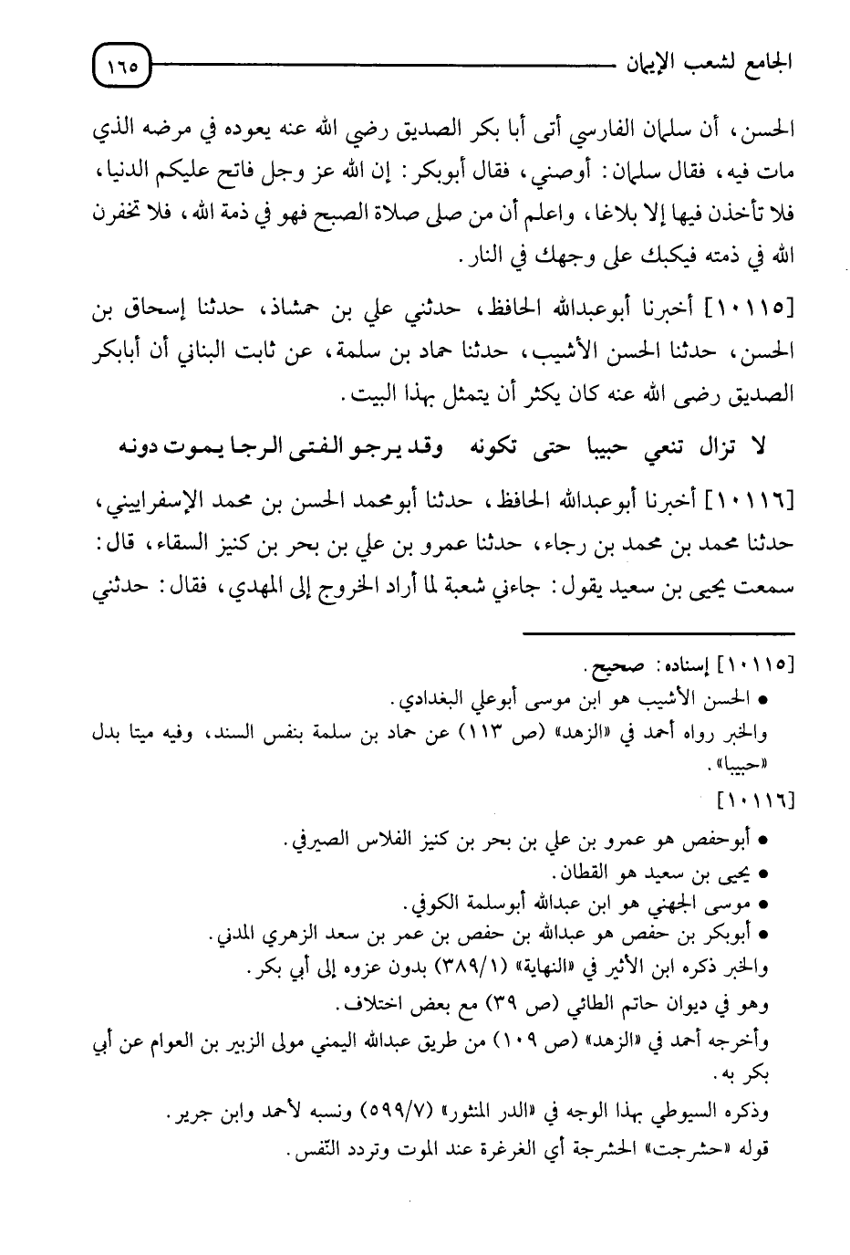 10116 - أَخْبَرَنَا أَبُو عَبْدِ اللهِ الْحَافِظُ، ثَنَا أَبُو مُحَمَّدٍ الْحَسَنُ بْنُ مُحَمَّدٍ الْإِسْفِرَايِينِيُّ، ثَنَا مُحَمَّدُ بْنُ مُحَمَّدِ بْنِ رَجَاءٍ، ثَنَا عَمْرُو بْنُ عَلِيِّ بْنِ بَحْرِ بْنِ كََنِيزٍ السَّقَّا، قَالَ: سَمِعْتُ يَحْيَى بْنَ سَعِيدٍ، يَقُولُ: جَاءَنِي شُعْبَةُ لَمَّا أَرَادَ الْخُرُوجَ إِلَى الْمَهْدِيِّ فَقَالَ: حَدِّثْنِي -[166]- بِحَدِيثِ مُوسَى الْجُهَنِيِّ حَتَّى أُحَدِّثَ بِهِ الْمَهْدِيَّ، قَالَ مُحَمَّدُ بْنُ مُحَمَّدِ بْنِ رَجَاءٍ: حَدَّثَنَا أَبُو حَفْصٍ، أَنَا يَحْيَى بْنُ سَعِيدٍ، أَنَا مُوسَى الْجُهَنِيُّ أَبُو بَكْرِ بْنُ حَفْصٍ قَالَ: جَاءَتْ عَائِشَةُ إِلَى أَبِيهَا وَهُوَ يُعَالِجُ مَا يُعَالِجُ مِنَ الْمَوْتِ، فَلَمَّا رَأَتْ نَفْسَهُ فِي صَدْرِهِ تَمَثَّلَتْ بِهَذَا الْبَيْتِ: