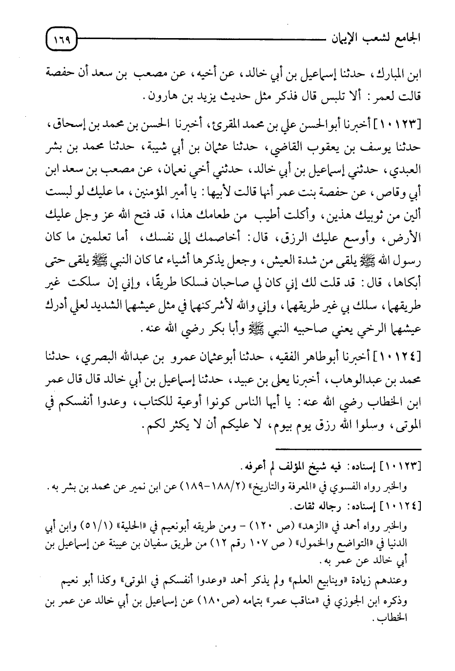 10123 - أَخْبَرَنَا أَبُو الْحَسَنِ عَلِيُّ بْنُ مُحَمَّدٍ الْمُقْرِئُ، أَنَا الْحَسَنُ بْنُ مُحَمَّدِ بْنِ إِسْحَاقَ، ثَنَا يُوسُفُ بْنُ يَعْقُوبَ الْقَاضِي، ثَنَا عُثْمَانُ بْنُ أَبِي شَيْبَةَ، ثَنَا مُحَمَّدُ بْنُ بِشْرٍ الْعَبْديُّ، حَدَّثَنِي إِسْمَاعِيلُ بْنُ أَبِي خَالِدٍ، حَدَّثَنِي أَخِي نُعْمَانُ، عَنْ مُصْعَبِ بْنِ سَعْدِ بْنِ أَبِي وَقَّاصٍ، عَنْ حَفْصَةَ بِنْتِ عُمَرَ، أَنَّهَا قَالَتْ لِأَبِيهَا: " يَا أَمِيرَ الْمُؤْمِنِينَ، §مَا عَلَيْكَ لَوْ لَبِسْتَ أَلْيَنَ مِنْ ثَوْبَيْكَ هَذَيْنِ، وَأَكَلْتَ أَطْيَبَ مِنْ طَعَامِكَ هَذَا، وَقَدْ فَتَحَ اللهُ عَزَّ وَجَلَّ عَلَيْكَ الْأَرْضَ، وَأَوْسَعَ عَلَيْكَ الرِّزْقَ. قَالَ: أُخَاصِمُكِ إِلَى نَفْسِكِ، أَمَا تَعْلَمِينَ مَا كَانَ رَسُولُ اللهِ صَلَّى اللَّهُ عَلَيْهِ وَسَلَّمَ يَلْقَى مِنْ شِدَّةِ الْعَيْشِ وَجَعَلَ يُذَكِّرُهَا أَشْيَاءَ، مِمَّا كَانَ النَّبِيُّ صَلَّى اللَّهُ عَلَيْهِ وَسَلَّمَ يَلْقَى حَتَّى أَبْكَاهَا قَالَ: قَدْ قُلْتُ لَكِ: إِنِّي كَانَ لِي صَاحِبَانِ فَسَلَكَا طَرِيقًا وَإِنِّي إِنْ سَلَكَتُ غَيْرَ طَرِيقِهِمَا سُلِكَ بِي غَيْرَ طَرِيقِهِمَ، وَإِنِّي وَاللهِ لَأُشْرِكُهُمَا فِي مِثْلِ عَيْشِهِمَا الشَّدِيدُ لِعَلِّي أُدْرِكُ عَيْشَهُمَا الرَّضِيُّ - يَعْنِي بَصَاحِبَيْهِ النَّبِيَّ صَلَّى اللَّهُ عَلَيْهِ وَسَلَّمَ، وَأَبَا بَكْرٍ رَضِيَ اللهُ عَنْهُ - "