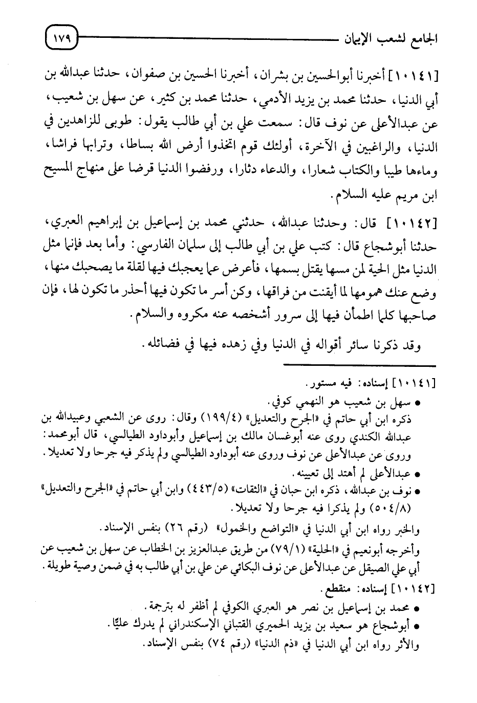 10141 - أَخْبَرَنَا أَبُو الْحُسَيْنِ بْنُ بُشْرَانَ، ثَنَا الْحُسَيْنُ بْنُ صَفْوَانَ، ثَنَا عَبْدُ اللهِ بْنُ أَبِي الدُّنْيَا، ثَنَا مُحَمَّدُ بْنُ يَزِيدَ الْأَدَمِيُّ، ثَنَا مُحَمَّدُ بْنُ كَثِيرٍ، عَنْ سَهْلِ بْنِ شُعَيْبٍ، عَنْ عَبْدِ الْأَعْلَى بْنِ نَوْفٍ، قَالَ: سَمِعْتُ عَلِيَّ بْنَ أَبِي طَالِبٍ، يَقُولُ: " §طُوبَى لِلزَّاهِدِينَ فِي الدُّنْيَا، وَالرَّاغِبِينَ فِي الْآخِرَةِ، أُولَئِكَ قَوْمٌ اتَّخَذُوا أَرْضَ اللهِ بِسَاطًا، وَتُرَابَهَا فِرَاشًا، وَمَاءَهَا طِيبًا، وَالْكِتَابَ شِعَارًا، وَالدُّعَاءَ دِثَارًا، وَرَفَضُوا الدُّنْيَا رَفْضًا عَلَى مِنْهَاجِ الْمَسِيحِ ابْنِ مَرْيَمَ عَلَيْهِ السَّلَامُ "
