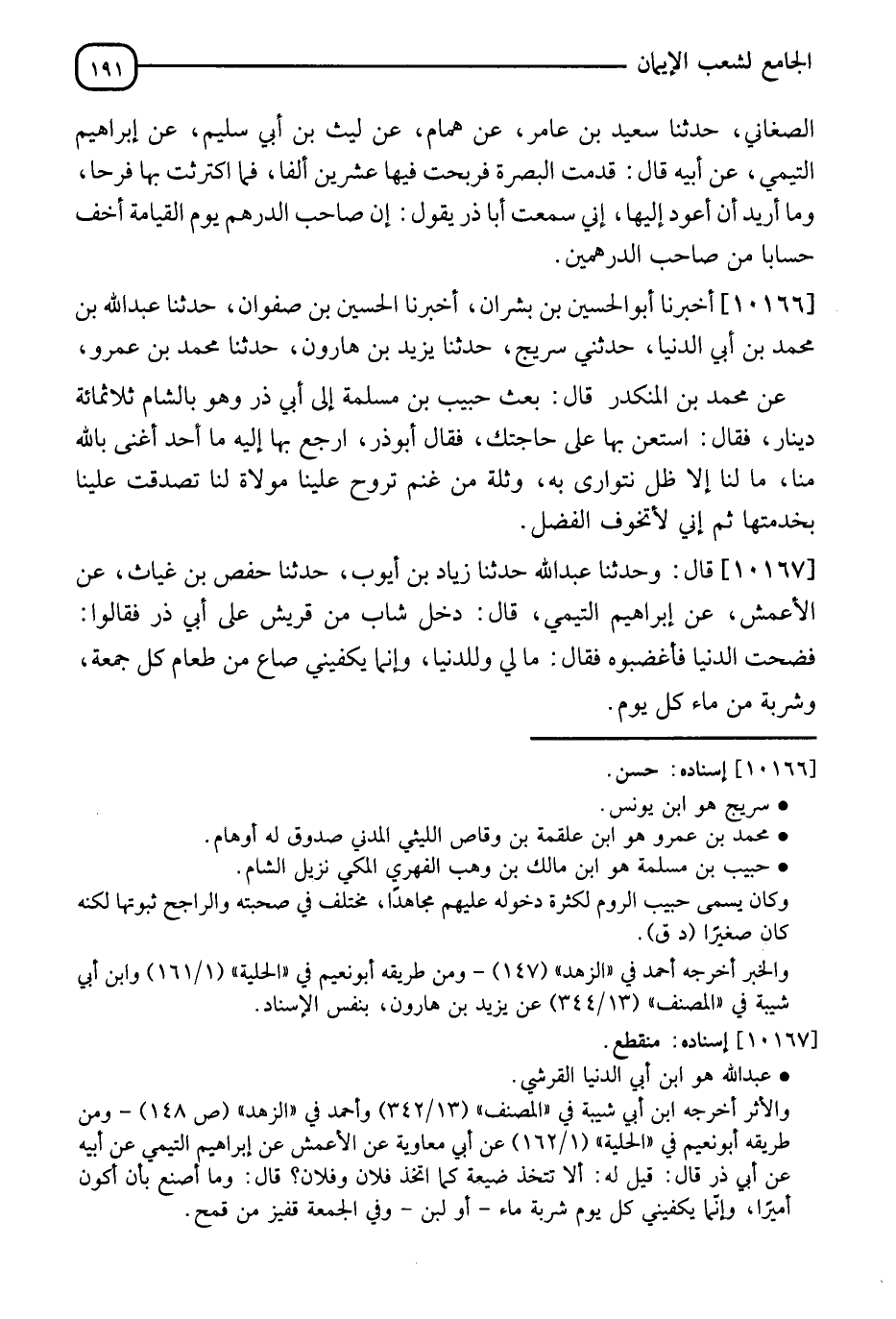 10167 - قَالَ: وَثَنَا عَبْدُ اللهِ، ثَنَا زِيَادُ بْنُ أَيُّوبَ، ثَنَا حَفْصُ بْنُ غِيَاثٍ، عَنِ الْأَعْمَشِ، عَنْ إِبْرَاهِيمَ التَّيْمِيُّ، قَالَ: دَخَلَ شَابٌّ مِنْ قُرَيْشٍ عَلَى أَبِي ذَرٍّ، فَقَالَ: فَضَحْتَ الدُّنْيَا، فَأَغْضَبُوهُ، فَقَالَ: " مَا لِي وَلِلدُّنْيَا §وَأَنَّمَا يَكْفِينِي صَاعٌ مِنْ طَعَامٍ كُلَّ جُمُعَةٍ، وَشَرْبَةُ مَاءٍ كُلَّ يَوْمٍ "