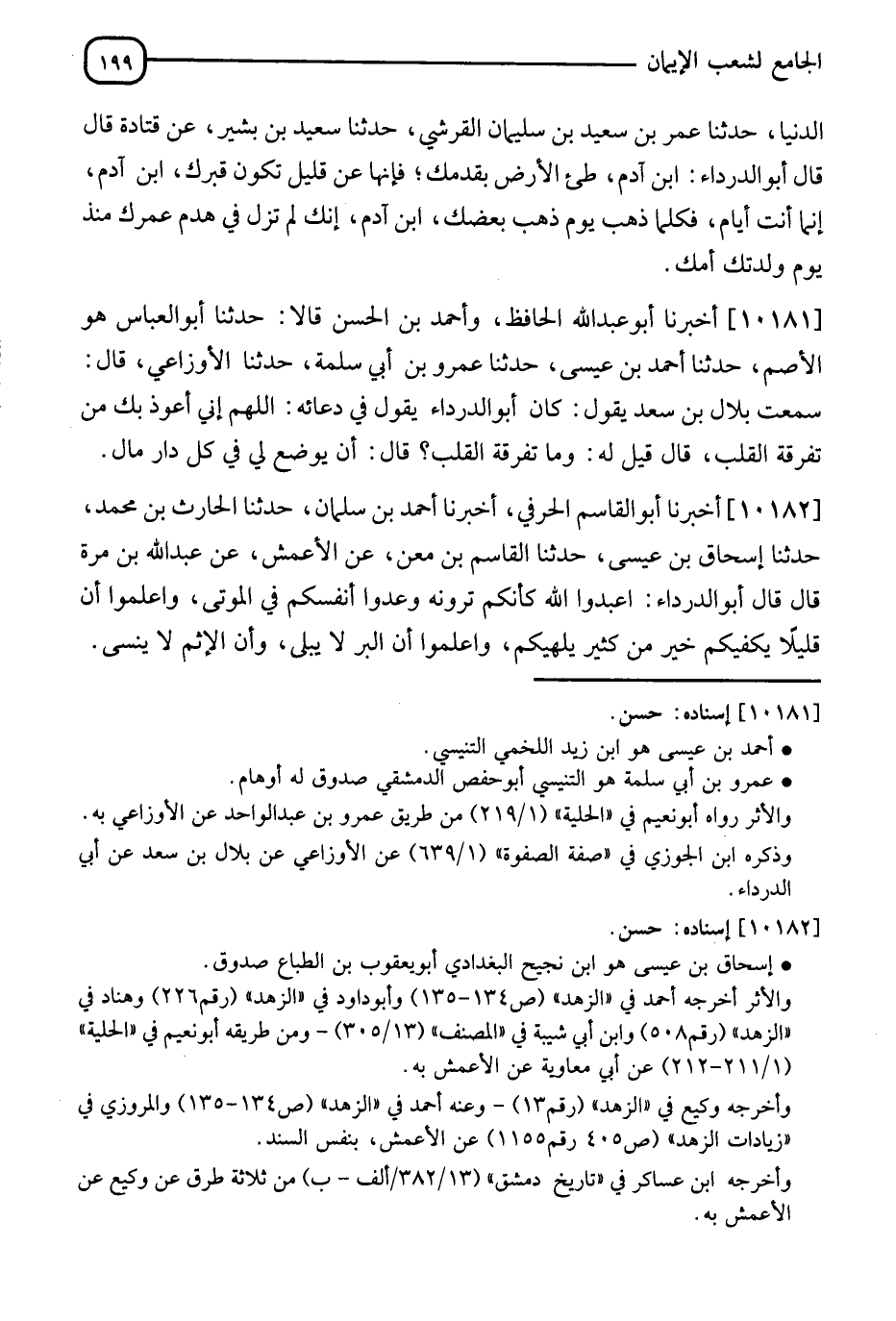 10181 - أَخْبَرَنَا أَبُو عَبْدِ اللهِ الْحَافِظُ، وَأَحْمَدُ بْنُ الْحَسَنِ، قَالَا: نَا أَبُو الْعَبَّاسِ هُوَ الْأَصَمُّ، نَا أَحْمَدُ بْنُ عِيسَى، نَا عَمْرُو بْنُ أَبِي سَلَمَةَ، نَا الْأَوْزَاعِيُّ، قَالَ: سَمِعْتُ بِلَالَ بْنَ سَعْدٍ، يَقُولُ: كَانَ أَبُو الدَّرْدَاءِ يَقُولُ فِي دُعَائِهِ: " §اللهُمَّ إِنِّي أَعُوذُ بِكَ مِنْ تَفْرِقَةِ الْقَلْبِ " قَالَ: قِيلَ لَهُ: وَمَا تَفْرِقَةُ الْقَلْبِ؟ قَالَ: " أَنْ يُوضَعَ لِي فِي كُلِّ دَارٍ مَالٌ "