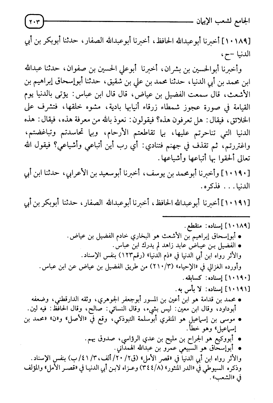 10189 - أَخْبَرَنَا أَبُو عَبْدِ اللهِ الْحَافِظُ، أَنَا أَبُو عَبْدِ اللهِ الصَّفَّارُ، نَا أَبُو بَكْرِ بْنُ أَبِي الدُّنْيَا، ح، وَأَخْبَرَنَا أَبُو الْحُسَيْنِ بْنُ بُشْرَانَ، أَنَا أَبُو عَلِيٍّ الْحُسَيْنُ بْنُ صَفْوَانَ، نَا عَبْدُ اللهِ بْنُ مُحَمَّدِ بْنِ أَبِي الدُّنْيَا، نَا مُحَمَّدُ بْنُ عَلِيِّ بْنِ شَقِيقٍ، نَا أَبُو إِسْحَاقَ إِبْرَاهِيمُ بْنُ الْأَشْعَثِ، قَالَ: سَمِعْتُ الْفُضَيْلَ بْنَ عِيَاضٍ، قَالَ: قَالَ ابْنُ عَبَّاسٍ: §" يُؤْتَى بِالدُّنْيَا يَوْمَ الْقِيَامَةِ فِي صُورَةِ عَجُوزٍ شَمْطَاءَ زَرْقَاءٌ أَنْيِابُهَا بَادِيَةٌ، مُشَوَّهٌ خَلْقُهَا، فَتُشْرِفُ عَلَى الْخَلَائِقِ فَيُقَالُ: هَلْ تَعْرِفُونَ بِهَذِهِ؟ فَيَقُولُونَ: نَعُوذُ بِاللهِ مِنْ مَعْرِفَةِ هَذِهِ، فَيُقَالُ: هَذِهِ الدُّنْيَا الَّتِي تَنَاحَرْتُمْ عَلَيْهَا، بِهَا تَقَاطَعْتُمُ الْأَرْحَامَ، وَبِهَا تَحَاسَدْتُمُ وَتَبَاغَضْتُمْ وَاغْتَرَرْتُمْ، ثُمَّ تُقْذَفُ فِي جَهَنَّمَ فَتُنَادِي: أَيْ رَبِّ، أَيْنَ اتْبَاعِي وَأَشْيَاعِي؟ فَيَقُولُ اللهُ تَعَالَى: أَلْحِقُوا بِهَا اتْبَاعَهَا وَأَشْيَاعَهَا ".