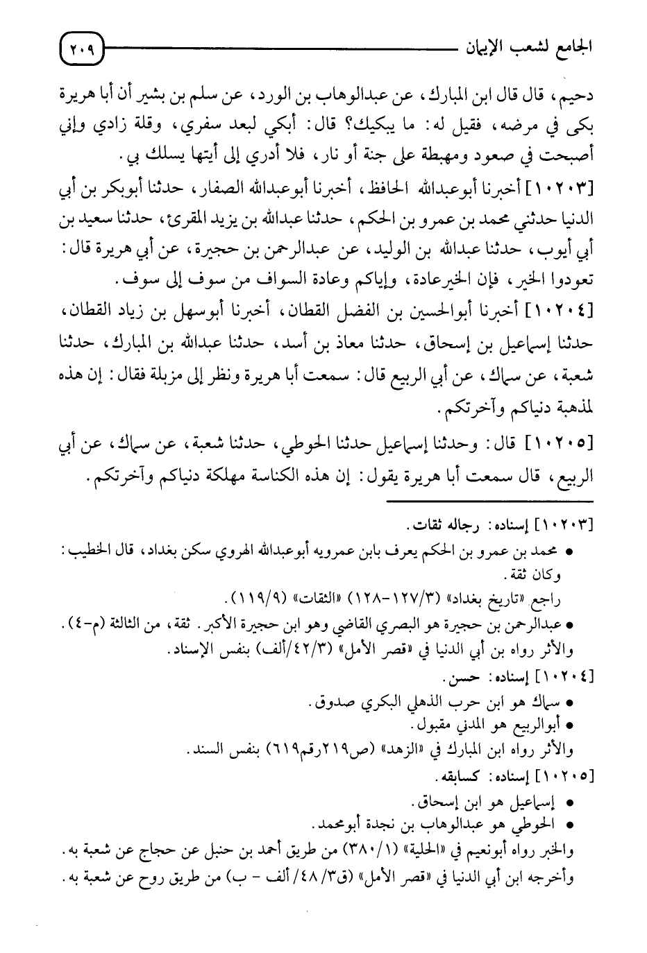 10204 - أَخْبَرَنَا أَبُو الْحُسَيْنِ بْنُ الْفَضْلِ الْقَطَّانُ، أَنَا أَبُو سَهْلِ بْنُ زِيَادٍ الْقَطَّانُ، نَا إِسْمَاعِيلُ بْنُ إِسْحَاقَ، نَا مُعَاذُ بْنُ أَسَدٍ، نَا عَبْدُ اللهِ بْنُ الْمُبَارَكِ، نَا شُعْبَةُ، عَنْ سِمَاكٍ، عَنْ أَبِي الرَّبِيعِ، قَالَ: سَمِعْتُ أَبَا هُرَيْرَةَ، §وَنَظَرَ إِلَى مَزْبَلَةٍ فَقَالَ: " إِنَّ هَذِهِ لَمُذْهِبَةُ دُنْيَاكُمْ وَآخِرَتِكُمْ "