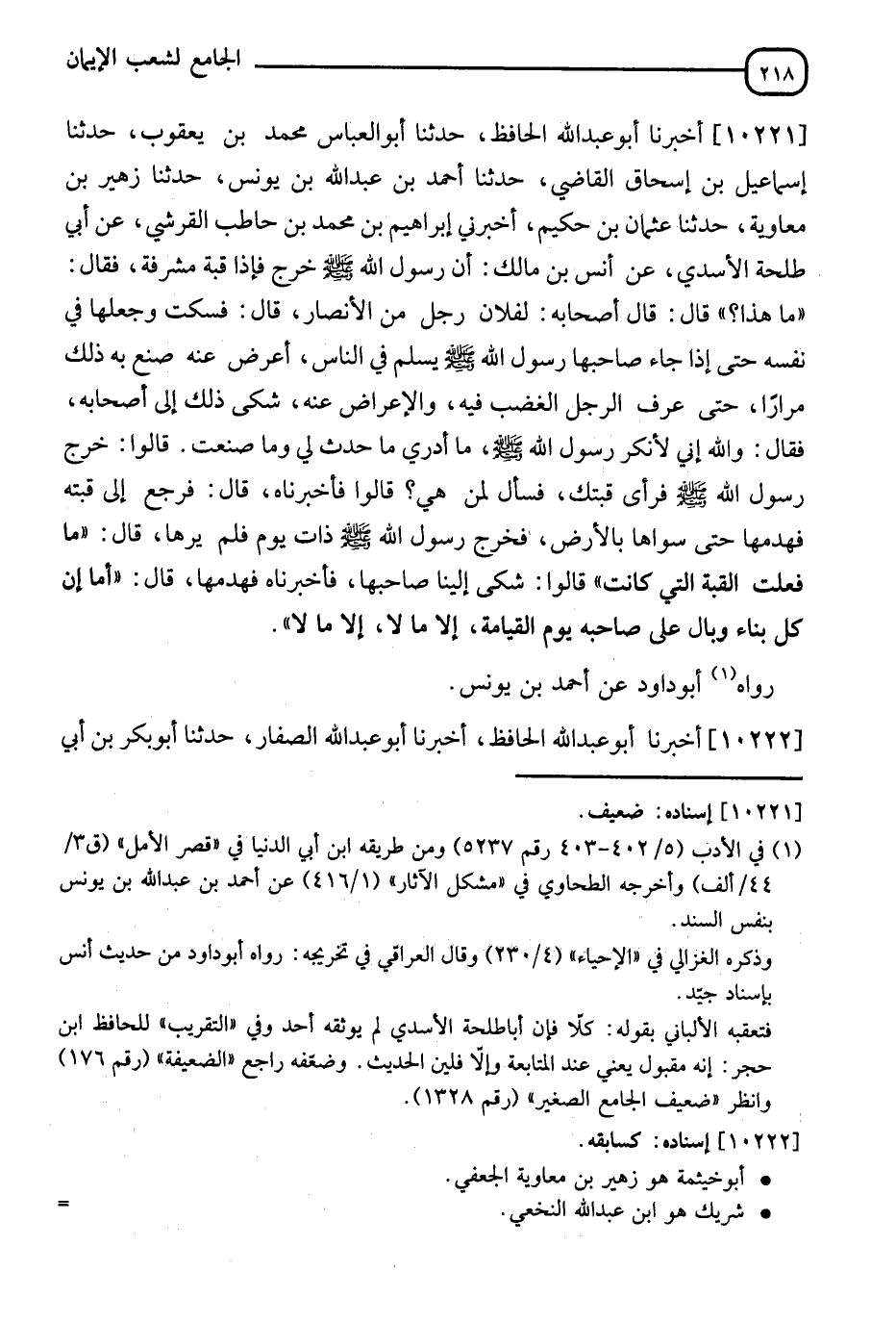 10221 - أَخْبَرَنَا أَبُو عَبْدِ اللهِ الْحَافِظُ، نَا أَبُو الْعَبَّاسِ مُحَمَّدُ بْنُ يَعْقُوبَ، أَنَا إِسْمَاعِيلُ بْنُ إِسْحَاقَ الْقَاضِي، نَا أَحْمَدُ بْنُ عَبْدِ اللهِ بْنِ يُونُسَ، نَا زُهَيْرُ بْنُ مُعَاوِيَةَ، نَا عُثْمَانُ بْنُ حَكِيمٍ، أَخْبَرَنِي إِبْرَاهِيمُ بْنُ مُحَمَّدِ بْنِ حَاطِبٍ الْقُرَشِيُّ، عَنْ أَبِي طَلْحَةَ الْأَسَدِيِّ، عَنْ أَنَسِ بْنِ مَالِكٍ، أَنَّ رَسُولَ اللهِ صَلَّى اللَّهُ عَلَيْهِ وَسَلَّمَ خَرَجَ فَإِذَا قُبَّةٌ مُشْرِفَةٌ فَقَالَ: " مَا هَذَا؟ " قَالَ: قَالَ أَصْحَابُهُ: لِفُلَانٍ رَجُلٌ مِنَ الْأَنْصَارِ، قَالَ: فَسَكَتَ، وَجَعَلَهَا فِي نَفْسِهِ حَتَّى إِذَا جَاءَ صَاحِبُهَا رَسُولَ اللهِ صَلَّى اللَّهُ عَلَيْهِ وَسَلَّمَ يُسَلِّمُ فِي النَّاسِ أَعْرَضَ عَنْهُ، صَنَعَ بِهِ ذَلِكَ مِرَارًا حَتَّى عَرَفَ الرَّجُلُ الْغَضَبَ فِيهِ، وَالْإِعْرَاضِ عَنْهُ شَكَى ذَلِكَ إِلَى أَصْحَابِهِ، فَقَالَ: وَاللهِ إِنِّي لَأُنْكِرُ رَسُولَ اللهِ صَلَّى اللَّهُ عَلَيْهِ وَسَلَّمَ، مَا أَدْرِي مَا حَدَثَ لِي وَمَا صَنَعَتُ؟ قَالُوا: خَرَجَ رَسُولُ اللهِ صَلَّى اللَّهُ عَلَيْهِ وَسَلَّمَ فَرَأَى قُبَّتَكَ فَسَأَلَ لِمَنْ هِيَ؟ قَالُوا: فَأَخْبَرْنَاهُ، قَالَ: فَخَرَجَ إِلَى قُبَّتِهِ فَهَدَمَهَا حَتَّى سَوَّاهَا بِالْأَرْضِ، فَخَرَجَ رَسُولُ اللهِ صَلَّى اللَّهُ عَلَيْهِ وَسَلَّمَ ذَاتَ يَوْمٍ فَلَمْ يَرَهَا، قَالَ: " مَا فَعَلَتِ الْقُبَّةُ الَّتِي كَانَتْ؟ " قَالَ: شَكَى إِلَيْنَا صَاحِبُهَا إِعْرَاضَكَ عَنْهُ فَأَخْبَرْنَاهُ فَهَدَمَهَا، قَالَ: " أَمَا إِنَّ §كُلَّ بِنَاءٍ وَبَالٌ عَلَى صَاحِبِهِ يَوْمَ الْقِيَامَةِ إِلَّا مَالًا إِلَّا مَالًا ". رَوَاهُ أَبُو دَاوُدَ، عَنْ أَحْمَدَ بْنِ يُونُسَ